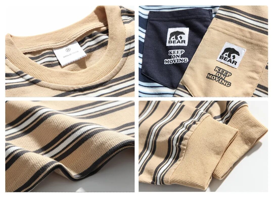 搭配解析:独特又活泼的日系穿搭!!经典条纹总有些不可或缺的魅力,减龄又有亲近感,完美展现春夏的活力。搭配黑色直筒牛仔裤,折叠裤脚,休闲不显拖沓。运动鞋、渔夫帽、斜挎包的加入,更有青春洋溢的文艺气息,这一套不普通且潮感十足,太吸引人了!棉氨纶混纺,柔软亲肤有弹力!圆领设计、袖筒围度大,简洁大方,上身更加自在。胸前纯色贴袋,复古又带点小趣味!经典的条纹加上宽松的版型,上身更能体现出阳光大男孩的氛围感,卡其与宝蓝两色,与天生自带活力感的条纹配合,分分钟让你脱颖而出!!