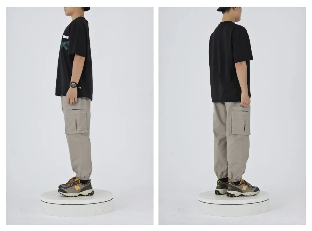 搭配解析:越穿越上头的工装风,谁看了不说一句好帅!百穿不腻的裤子,我只服这件束脚工装裤,怎么穿都好看。低调养眼的卡其色,相比黑色更有活力,日常出街完全不用花心思搭配,出门随便套一件自带时髦小心机的印花T,整条gai最潮的酷盖就是你。这件极具视觉冲击力的宝藏T,满足了我对印花T的所有幻象。前身大胆加入酷炫抢眼的3D线条英文印花,并且运用自带科技感的蓝绿色,立体呈现在经典的黑色T恤上,瞬间抓住所有人的目光。印花采用的是进口直喷工艺,看得见品质感,胸前和侧边还做了品牌独有的logo标,小细节很加分。面料细腻柔滑不易皱,质感满分。报型爷名字:立减10元(仅限今天!)(复制下方淘口令打开淘宝,或搜索框输入灰链接即可购买)