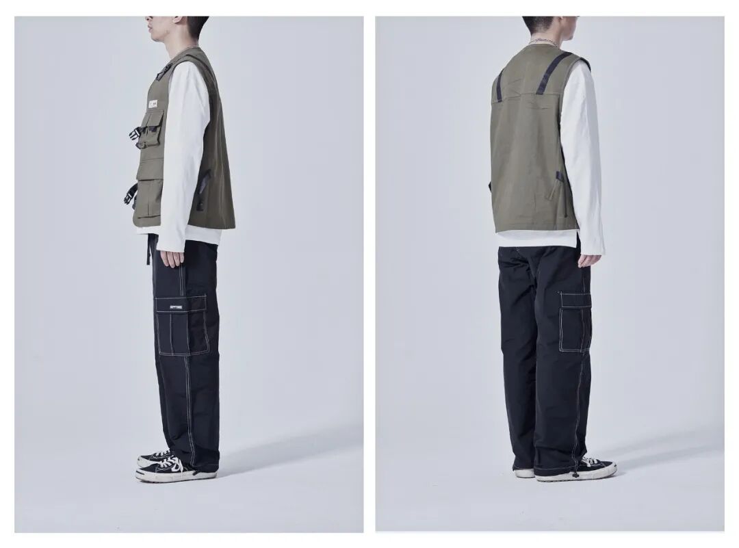 上身一件白色宽松长袖打底,外搭一件军绿色口袋战术马甲,再搭配一条宽松版型的黑色工装休闲,最后一双黑色开口笑帆布鞋,在质感与裤子呼应。
