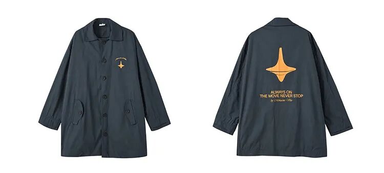 这款外套采用了经典的磨毛梭织面料制作,丝滑的手感非常亲肤,衣服为oversize的中长版型设计,前后幅印花以趣味性陀螺元素为主,袖口增加了束绳设计,增强了防风性能,外穿或者当中间层穿搭都很适合!