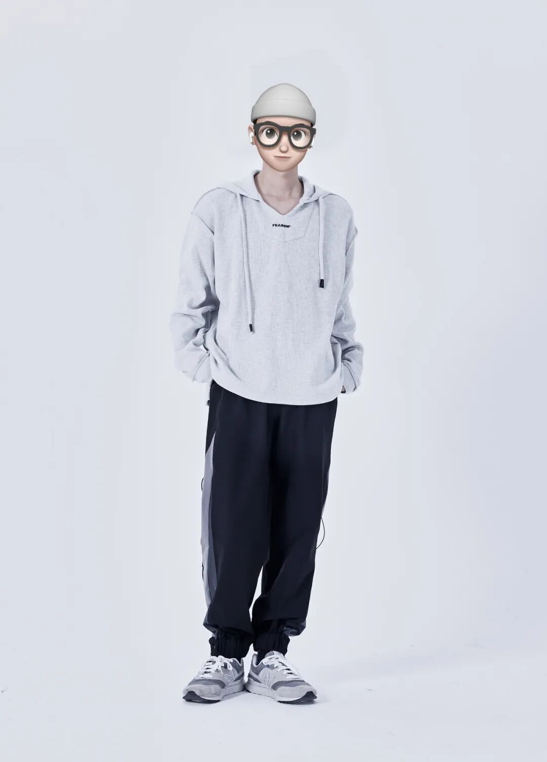上身套一件浅灰色华夫格套头卫衣,下身搭配一条黑色机能束脚锥形裤,最后上脚一双灰色撞色的New Balance 997H呼应卫衣、稳住重心。
