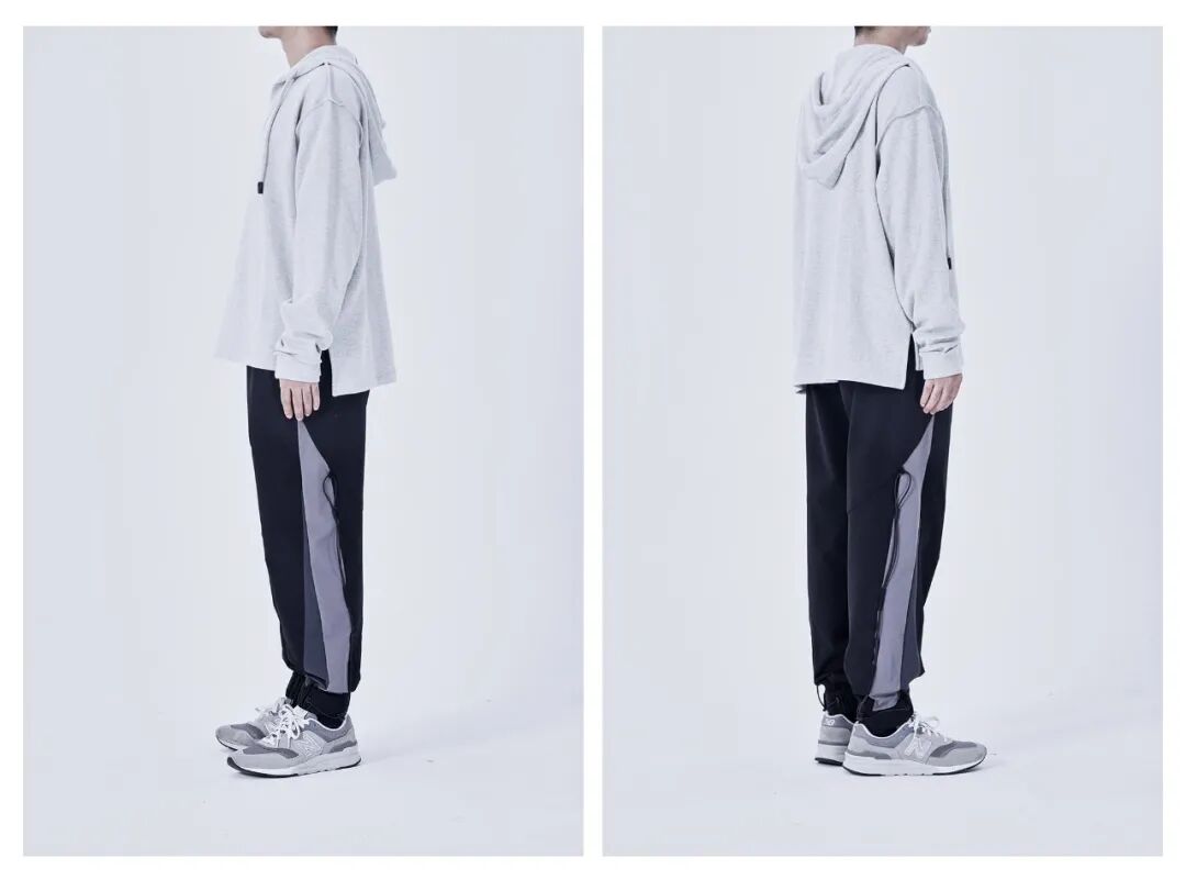 不管是套头卫衣搭配锥形裤,还是邻近色(浅灰、深灰、黑)的搭配,都是比较稳扎稳打的穿法;卫衣绳的不对称也能营造出一种随意的生活感和慵懒感。