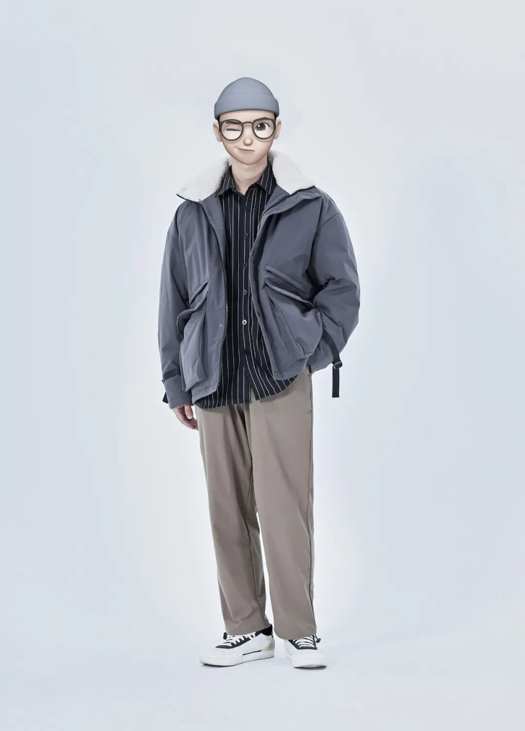 冬天的颜色穿得比较素的话,内搭可以选择花哨一点,适当做一下简繁搭配,譬如条纹衬衫,不管是在哪种穿搭风格里,它都算得上是非常常见的。最后低饱和度的衣服可以搭配一双白鞋来进行提亮,增加活力。