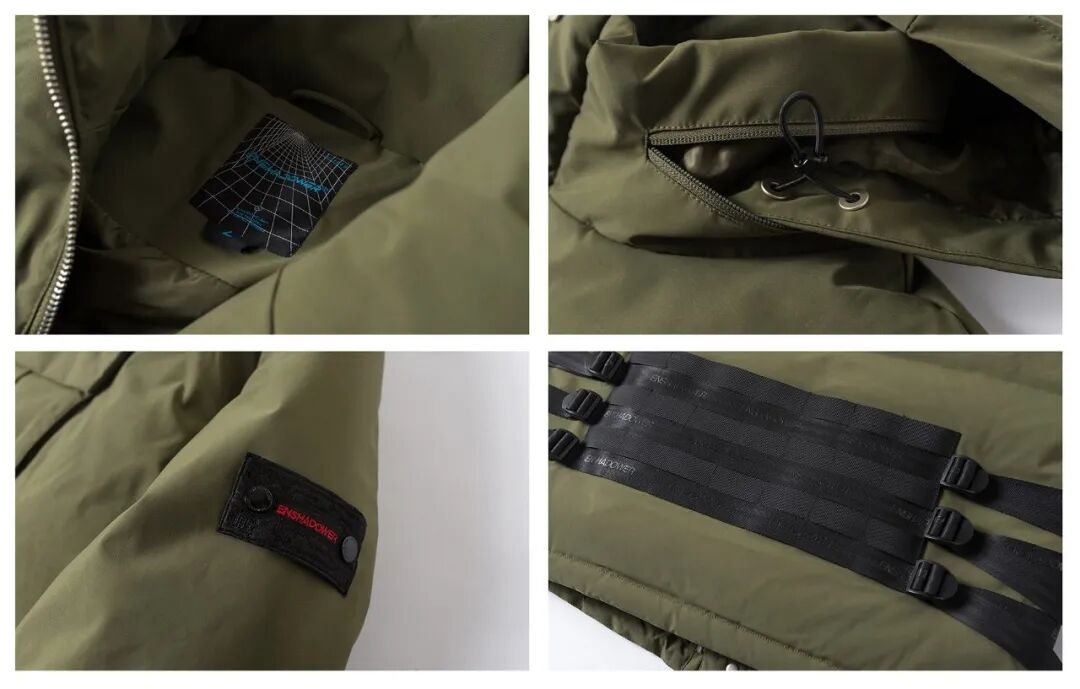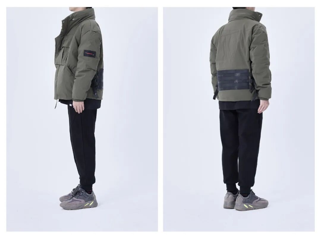 帅气又厚实的一件战术羽绒。非但帅气不臃肿,而且蓬松度极佳,白鸭绒含绒量高达90%,保暖度直接拉满!许多细节上的设计也是非常出彩,譬如领口拉链内的隐藏帽子、后背可以外拓展附包配件的Molle系统织带,以及前胸的收纳口袋设计,为衣服提供了保暖之外的很多实用性功能。入这一件的男生,真的很“细”!