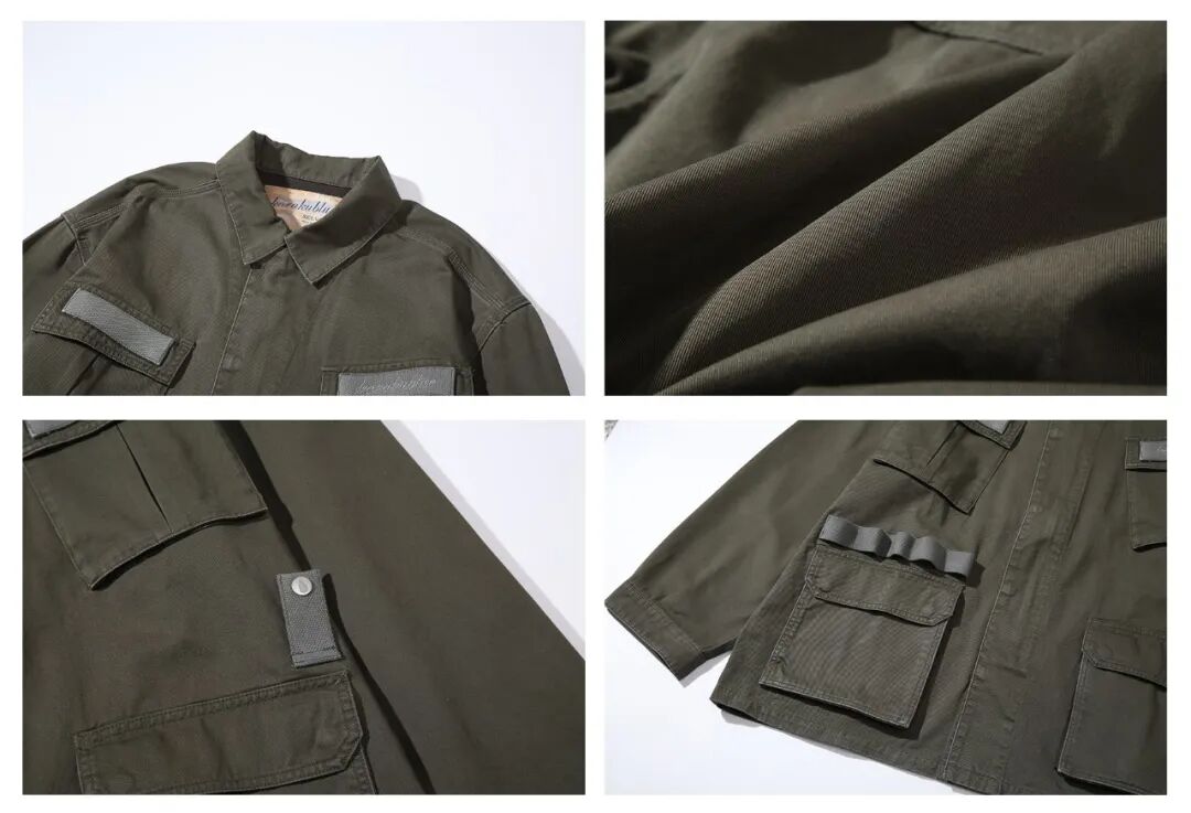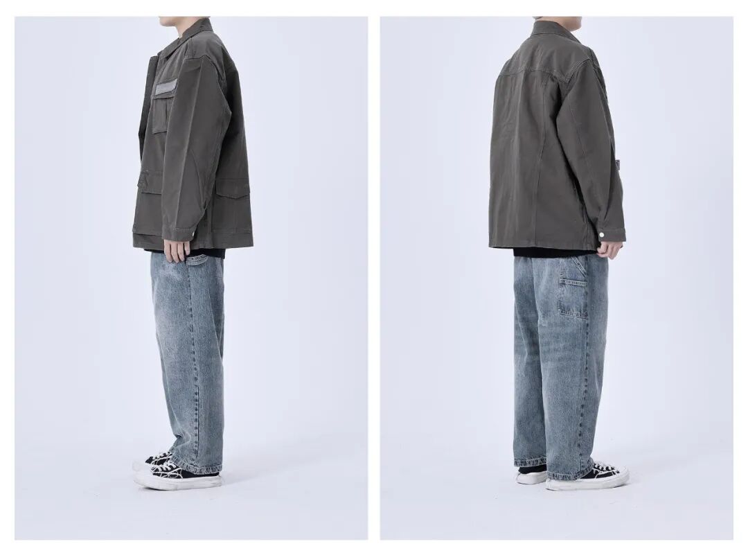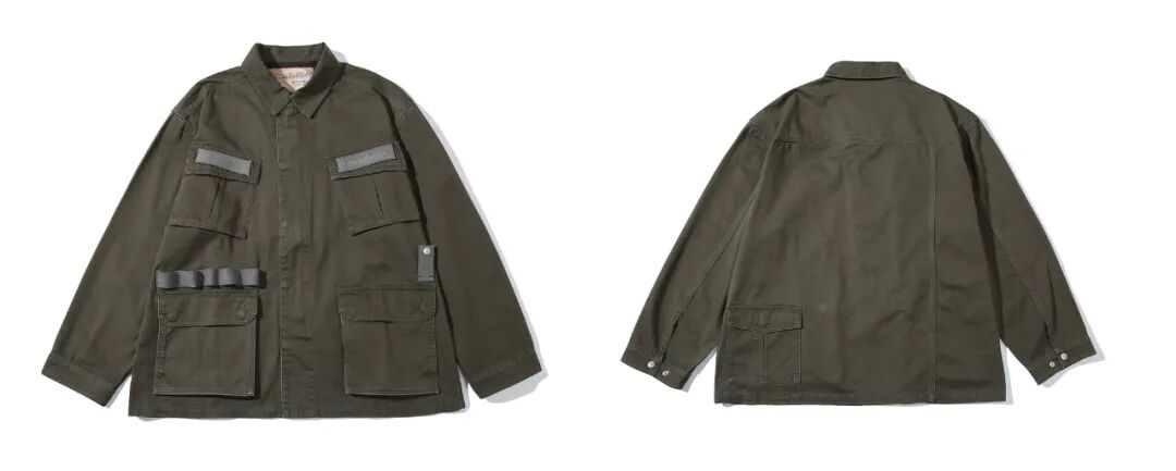 外套以丛林夹克作为延伸,借鉴了经典的M65夹克蓝本,成衣非常具有复古军味!因为采用了活性染的竹节面料,所以表面绒毛和竹节肌理感非常强,硬挺又厚实。细节方面,隐藏式纽扣、加厚帆布织带以及全身骨位的工业埋缝真的深得我心,紧凑感和顺畅度都极佳,简直就是军事风迷弟们的福音!