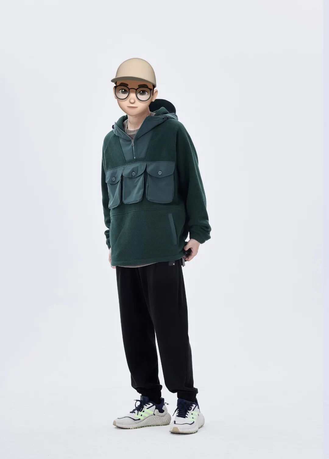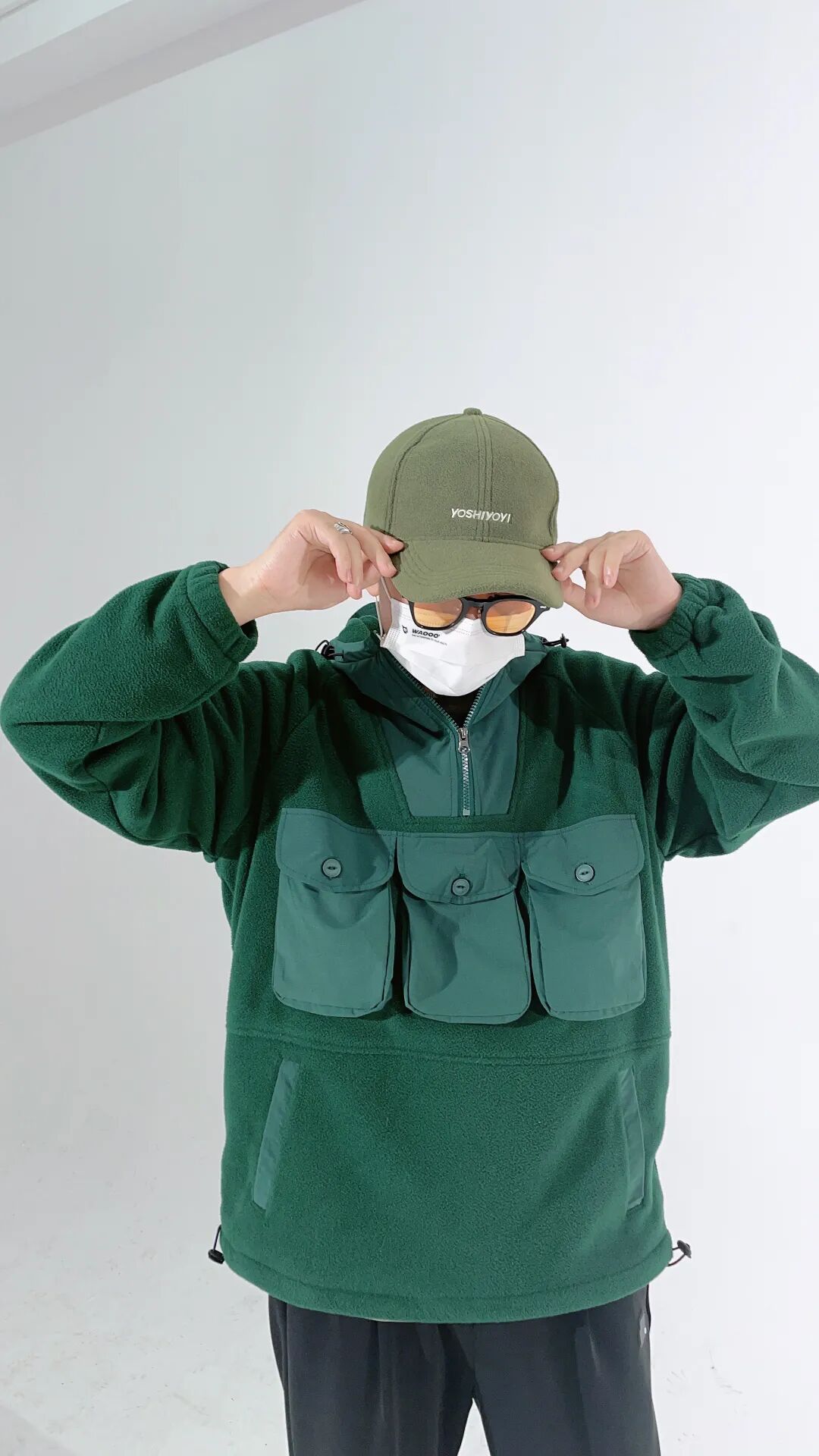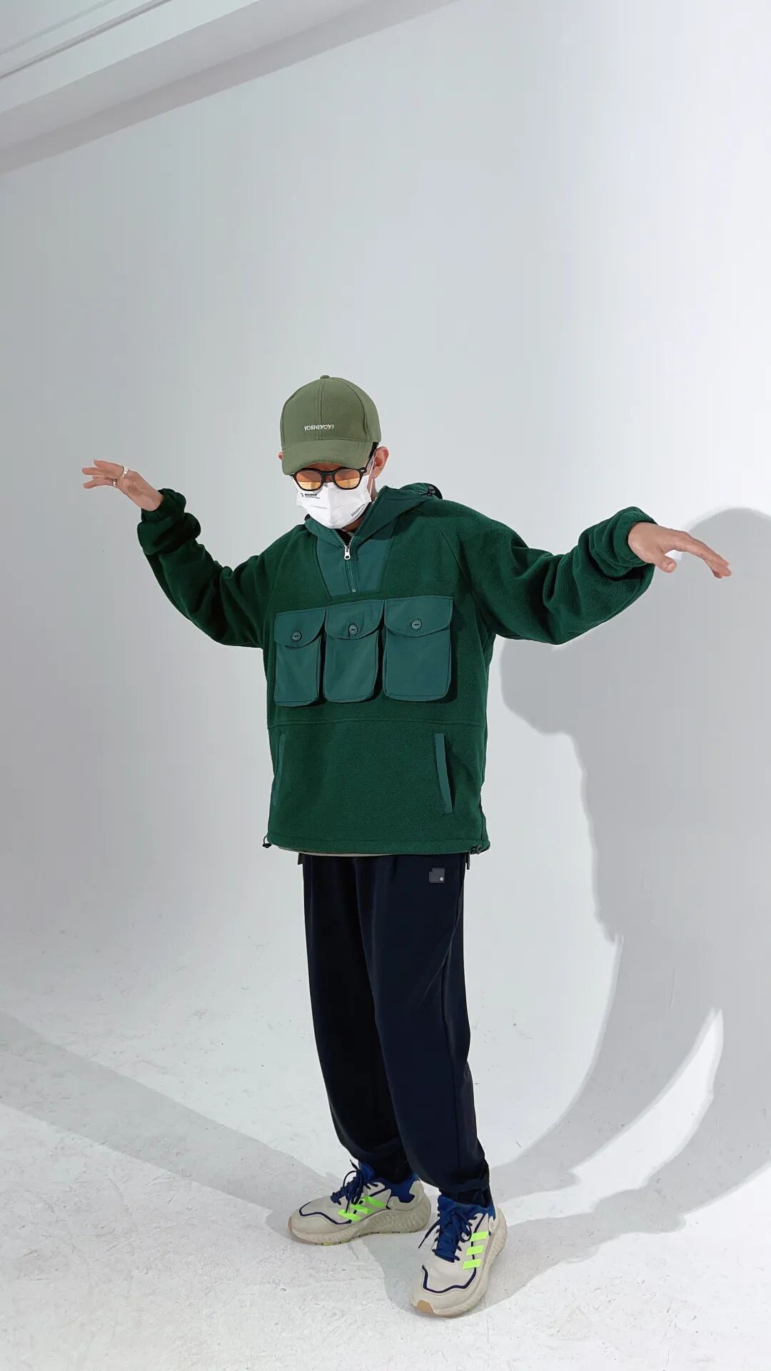 外搭一件墨绿色摇粒绒连帽卫衣,下身