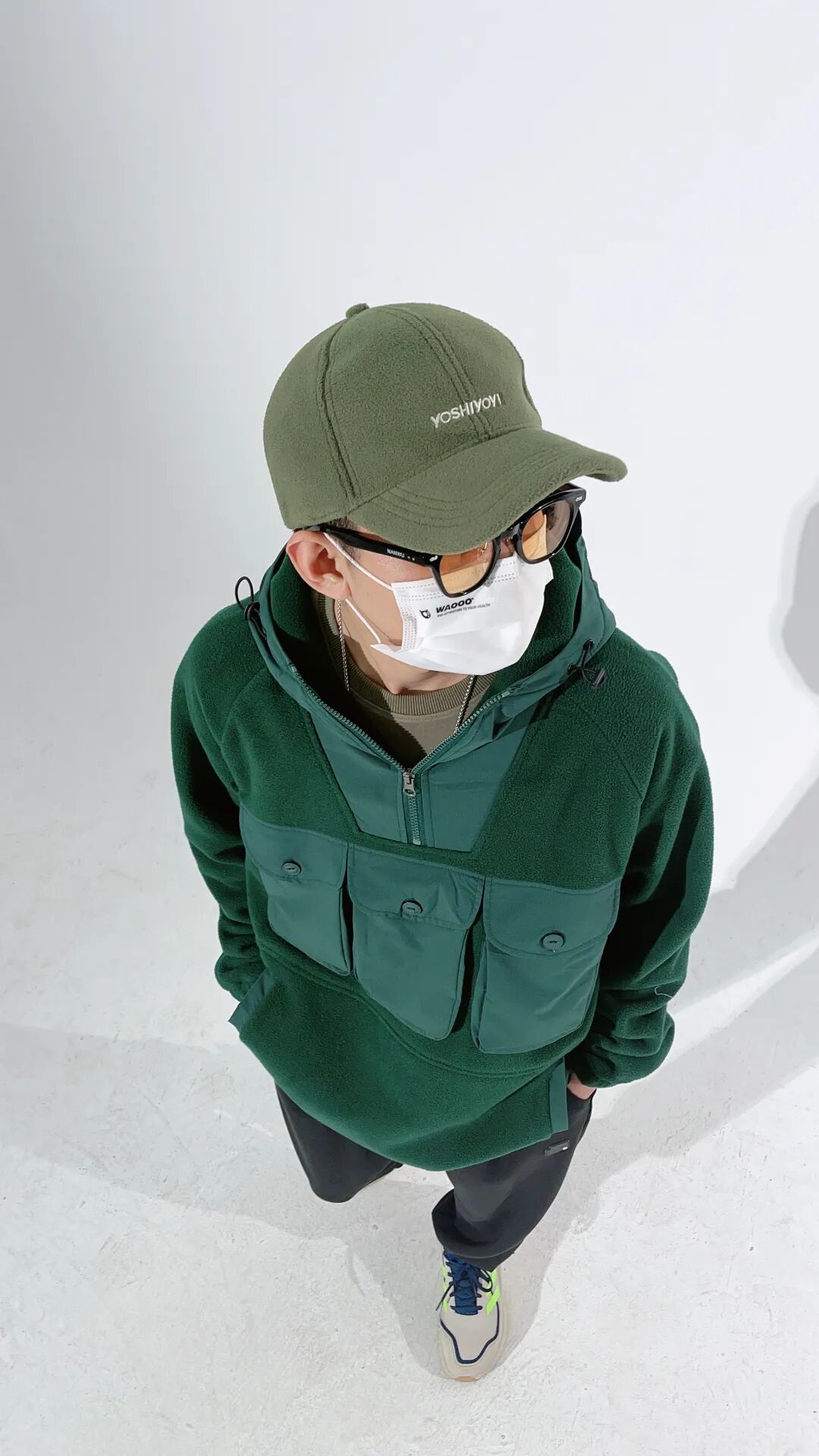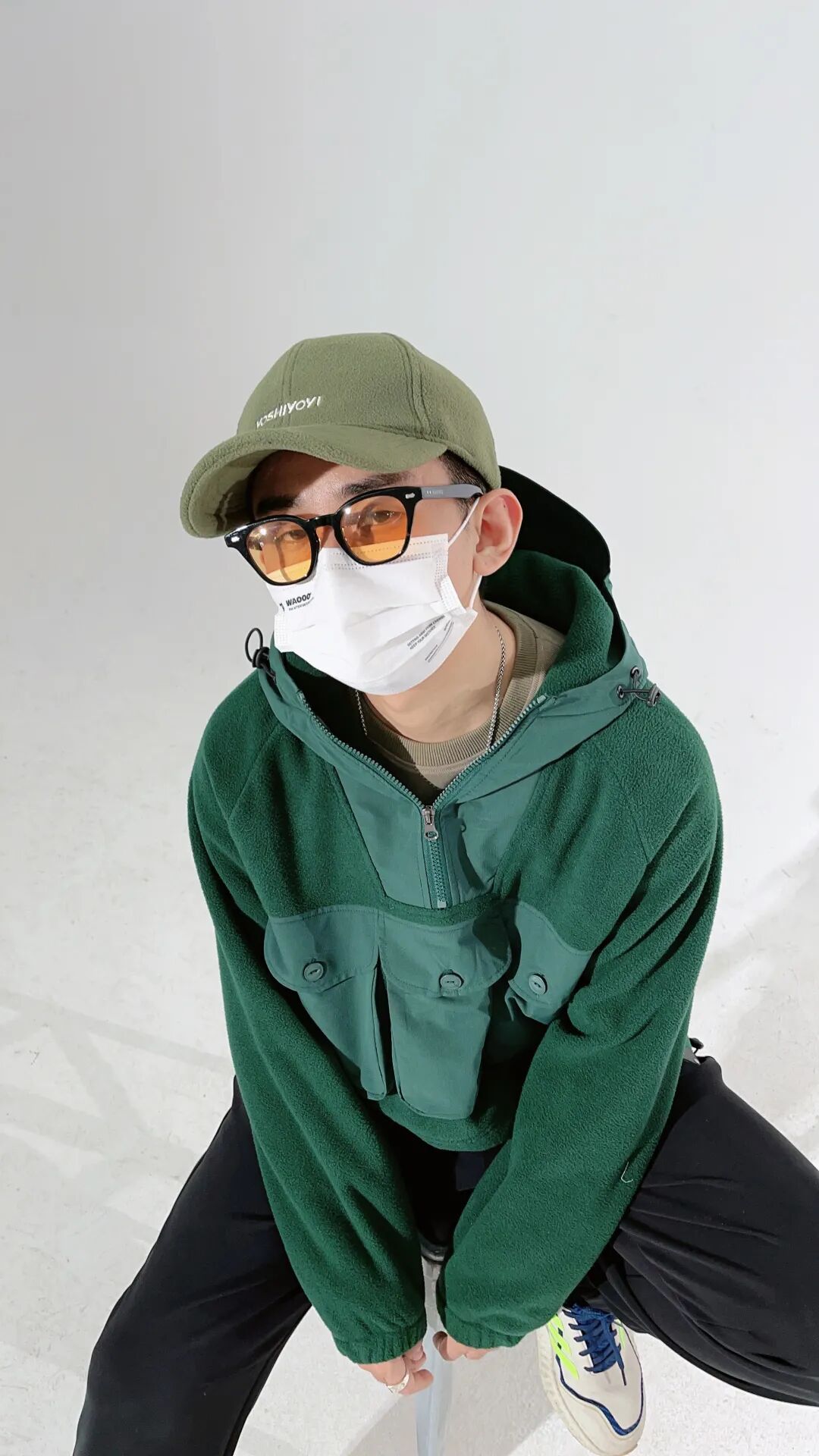 上半身从帽子、内搭到外套选择了绿色的邻近色搭配,明确主题;