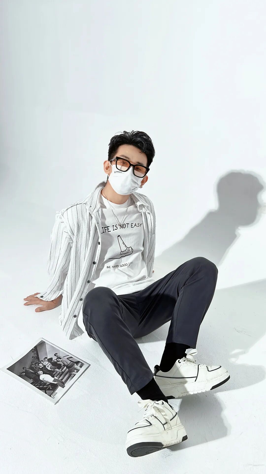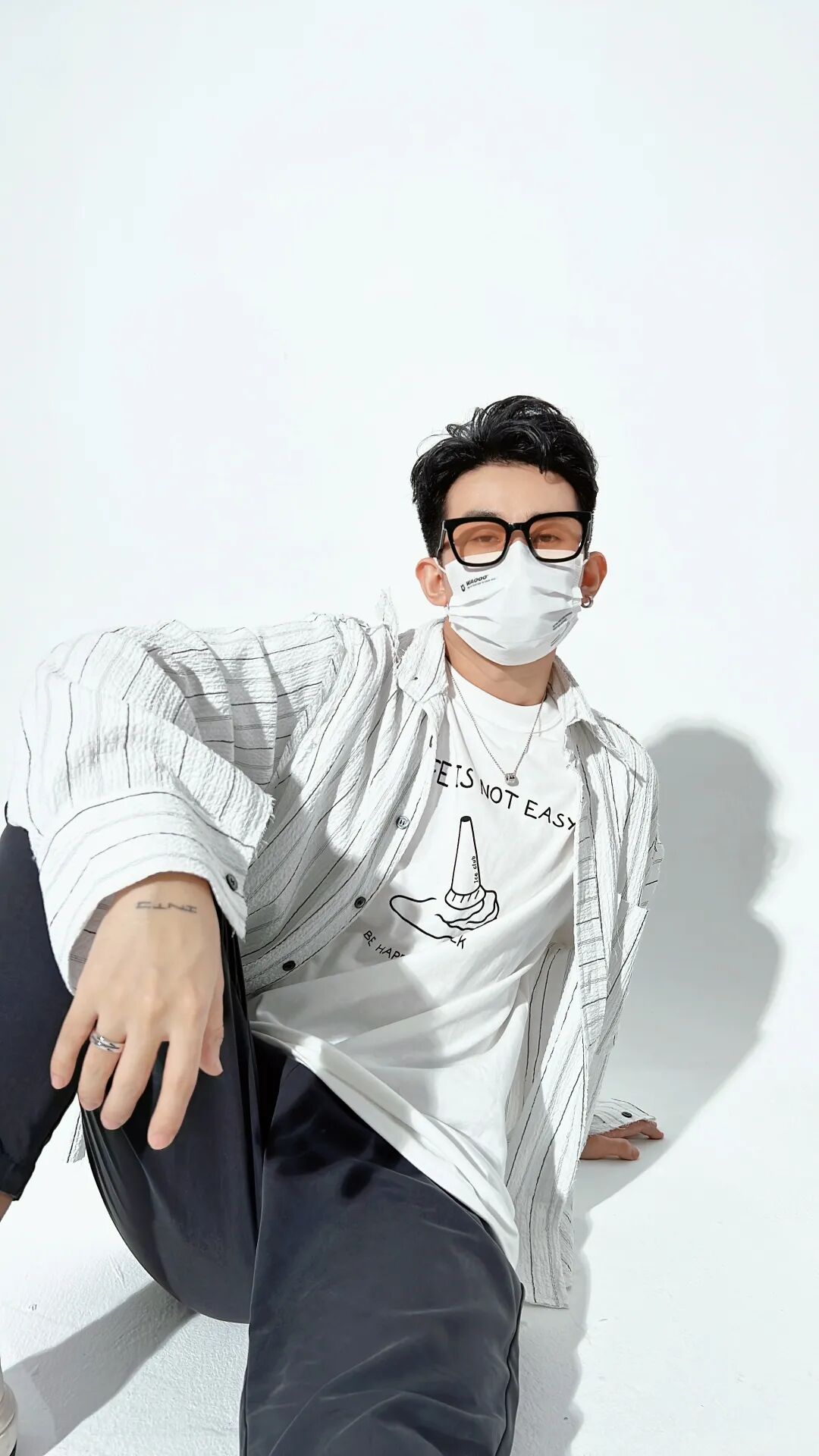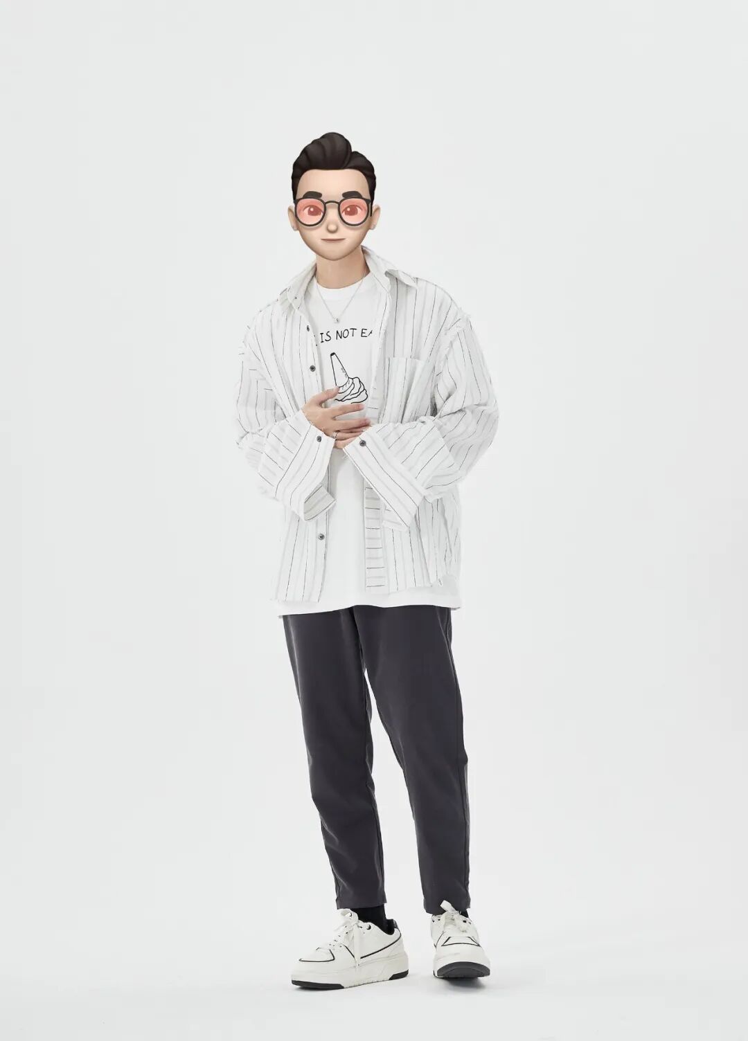 上身内搭一件白色趣味印花T恤,外穿白色竖条纹毛边长袖衬衫,下身搭配一条蓝灰色垂感抗皱九分休闲西裤,脚踩一双MLB白色厚底板鞋呼应上身。