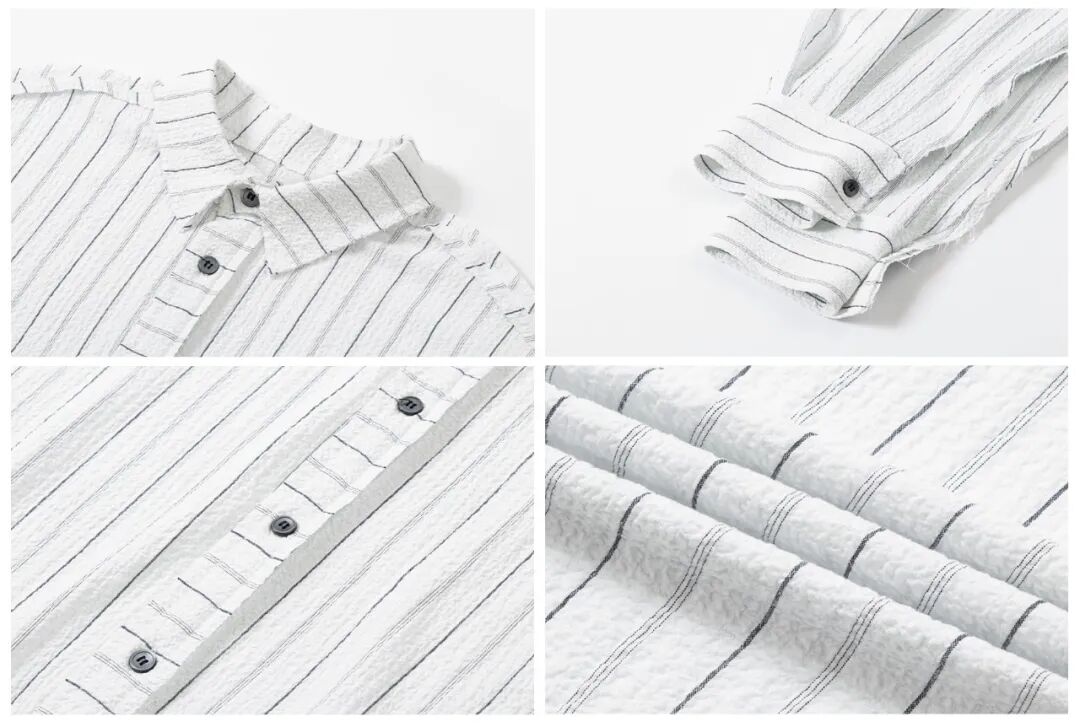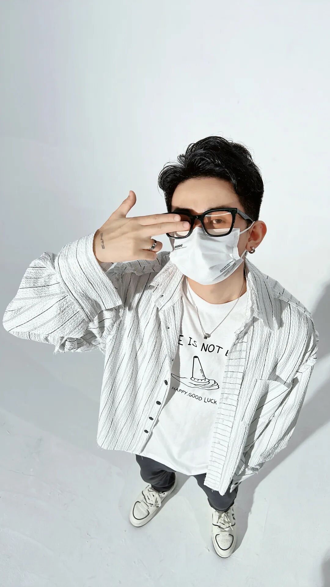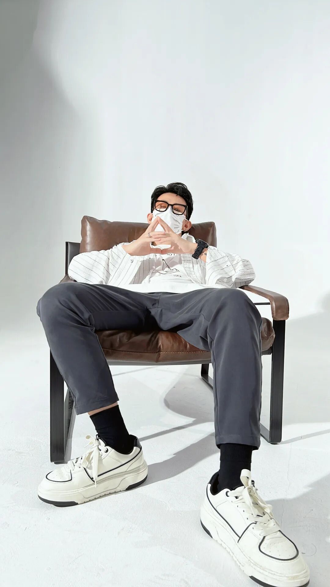 上身内搭一件白色趣味印花T恤,外穿白色竖条纹毛边长袖衬衫,下身搭配一条蓝灰色垂感抗皱九分休闲西裤,脚踩一双MLB白色厚底板鞋呼应上身。