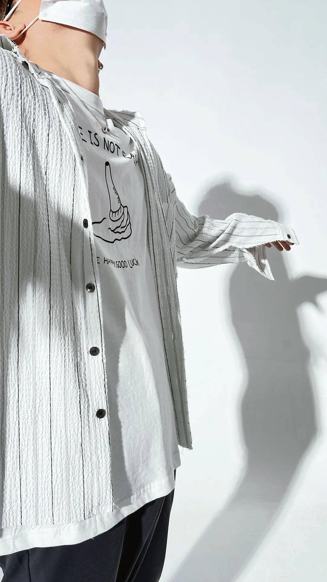 全衣采用了毛边处理的设计,自带肌理感,整体质感真的很高级!宽松+长款的衬衫版型,搭配起来干净又阳光,容易给人一种邻家男孩的感觉!喜欢韩系和休闲的小伙伴,可以冲一下它~