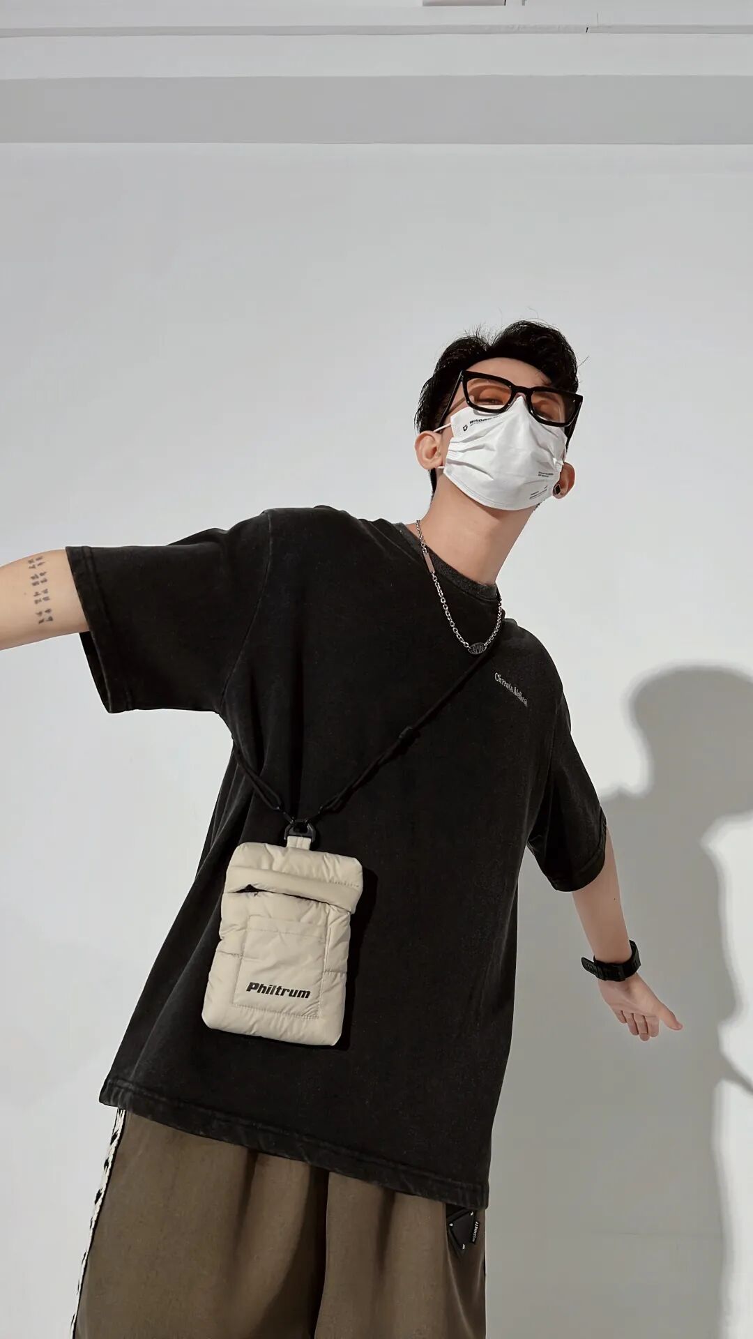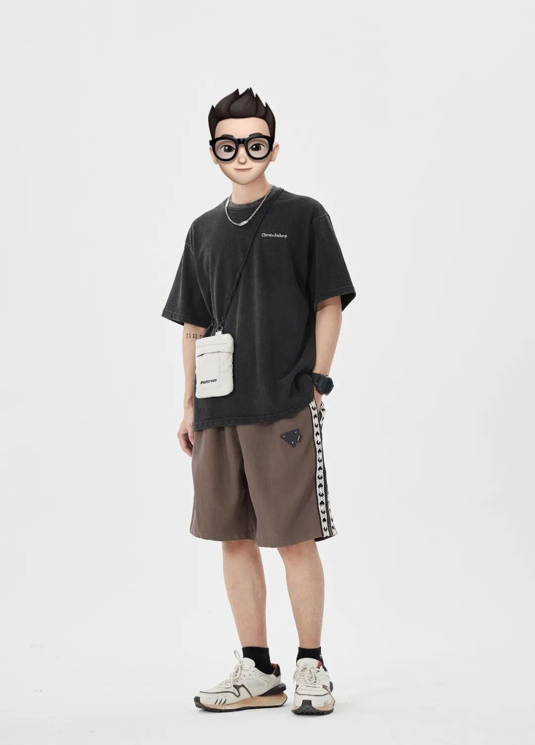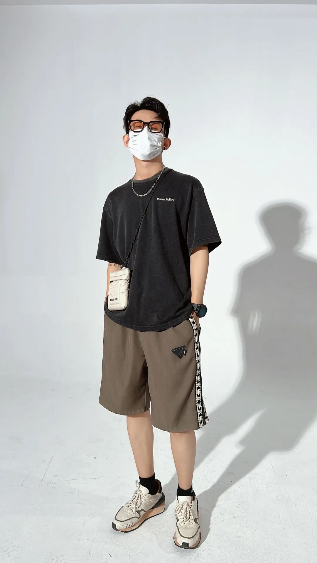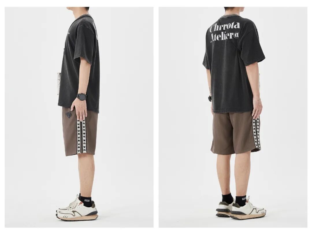 上身一件水洗做旧的黑色破碎印花T恤,下身搭配一条侧边织带设计的咖啡色宽松休闲五分裤,再脚踩一双米白色厚底复古慢跑鞋,最后搭上项链和白色小挎包,丰富整体。