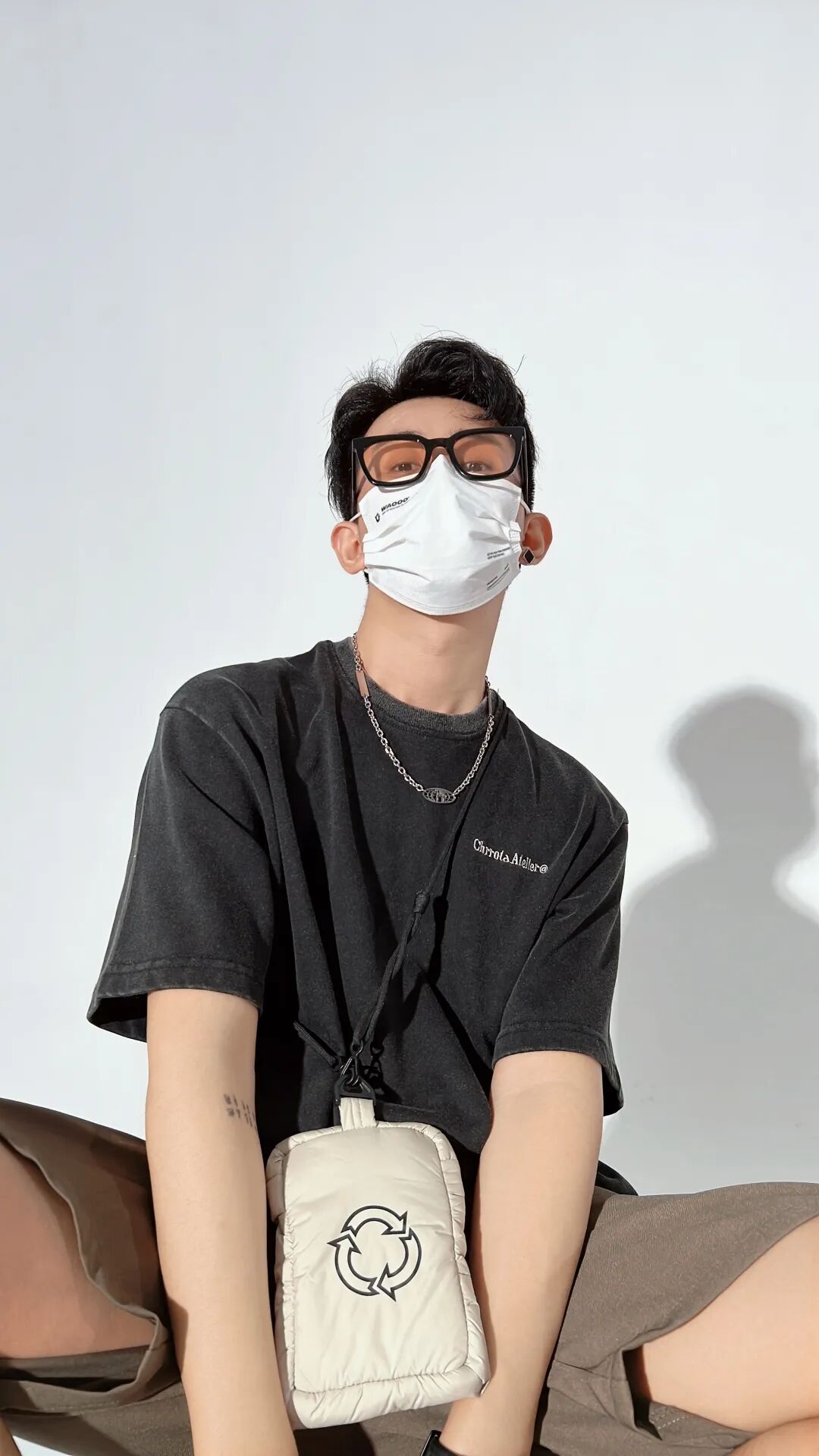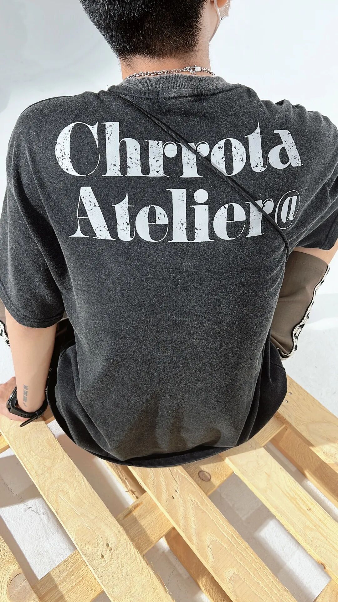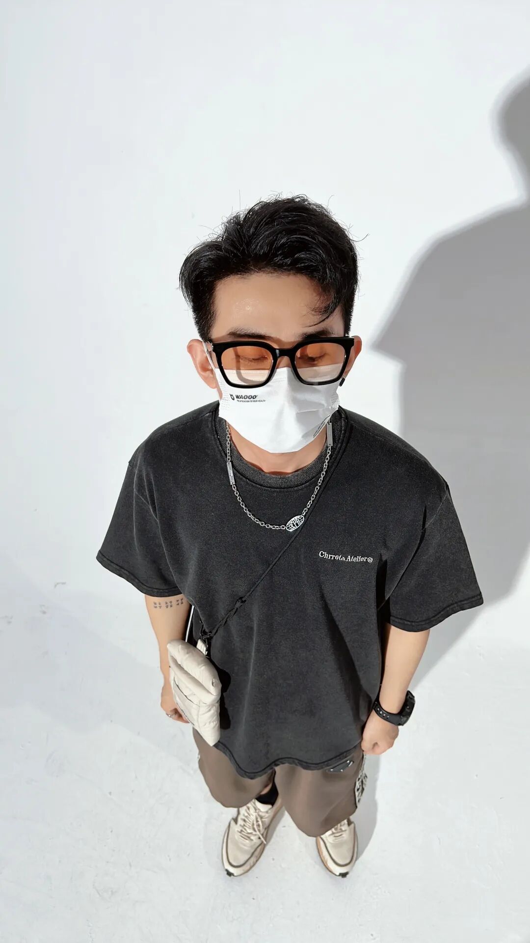 上身一件水洗做旧的黑色破碎印花T恤,下身搭配一条侧边织带设计的咖啡色宽松休闲五分裤,再脚踩一双米白色厚底复古慢跑鞋,最后搭上项链和白色小挎包,丰富整体。