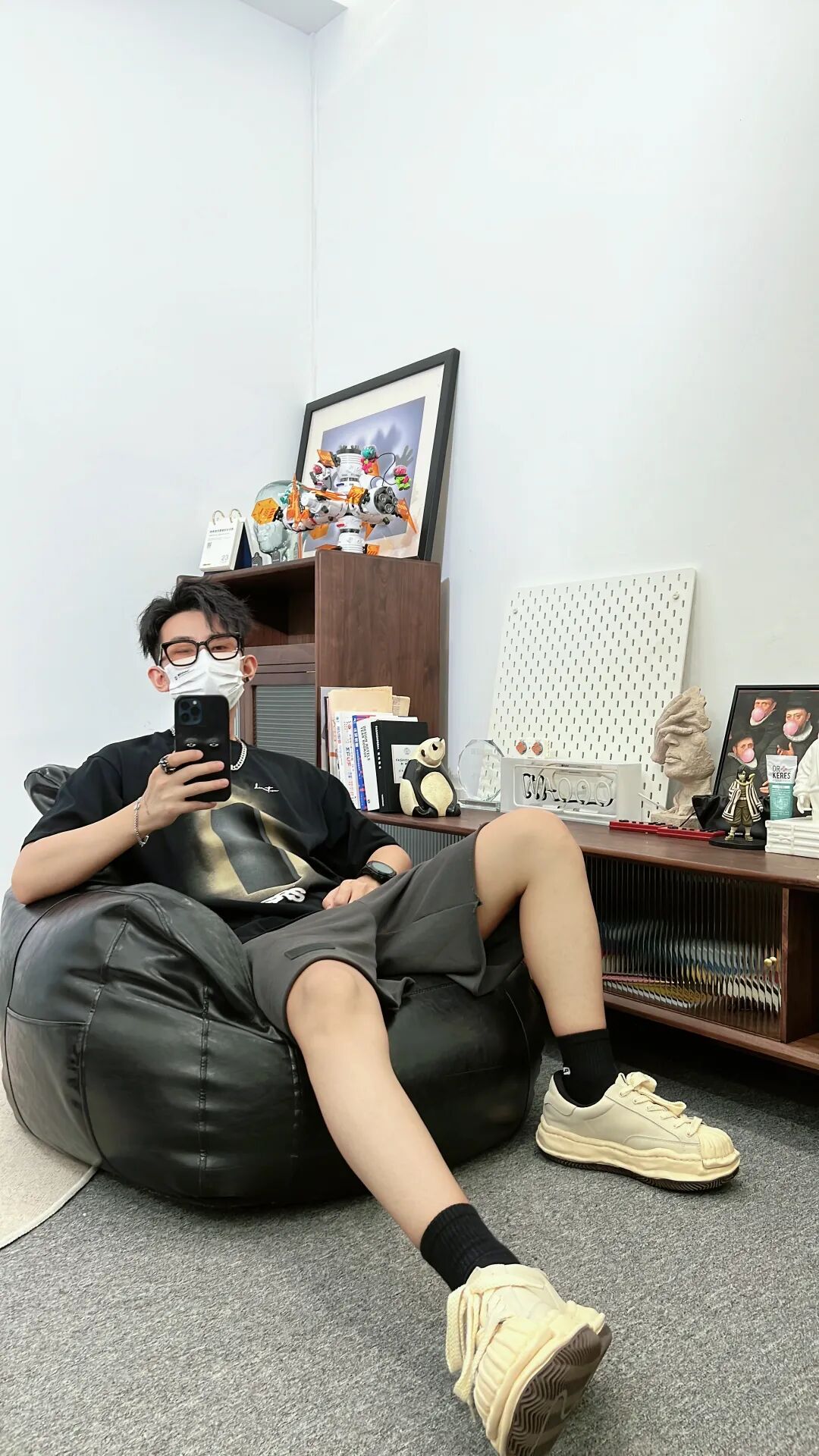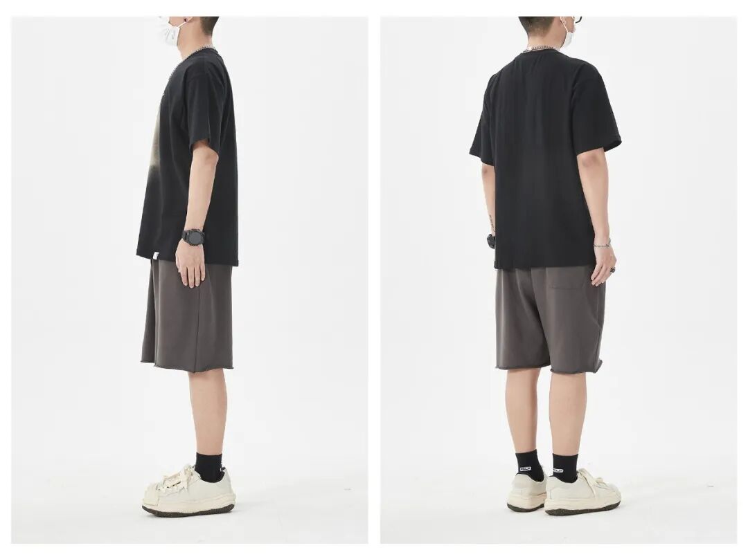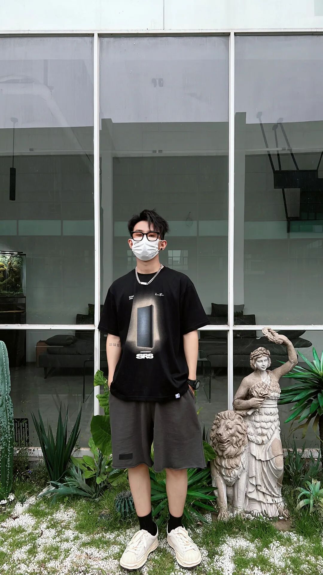 上身一件黑色石碑光影印花短T,下身一条灰色韩版运动基础款皮牌短裤,上脚黑色袜子搭配米白色多嘴驴厚底溶解鞋!