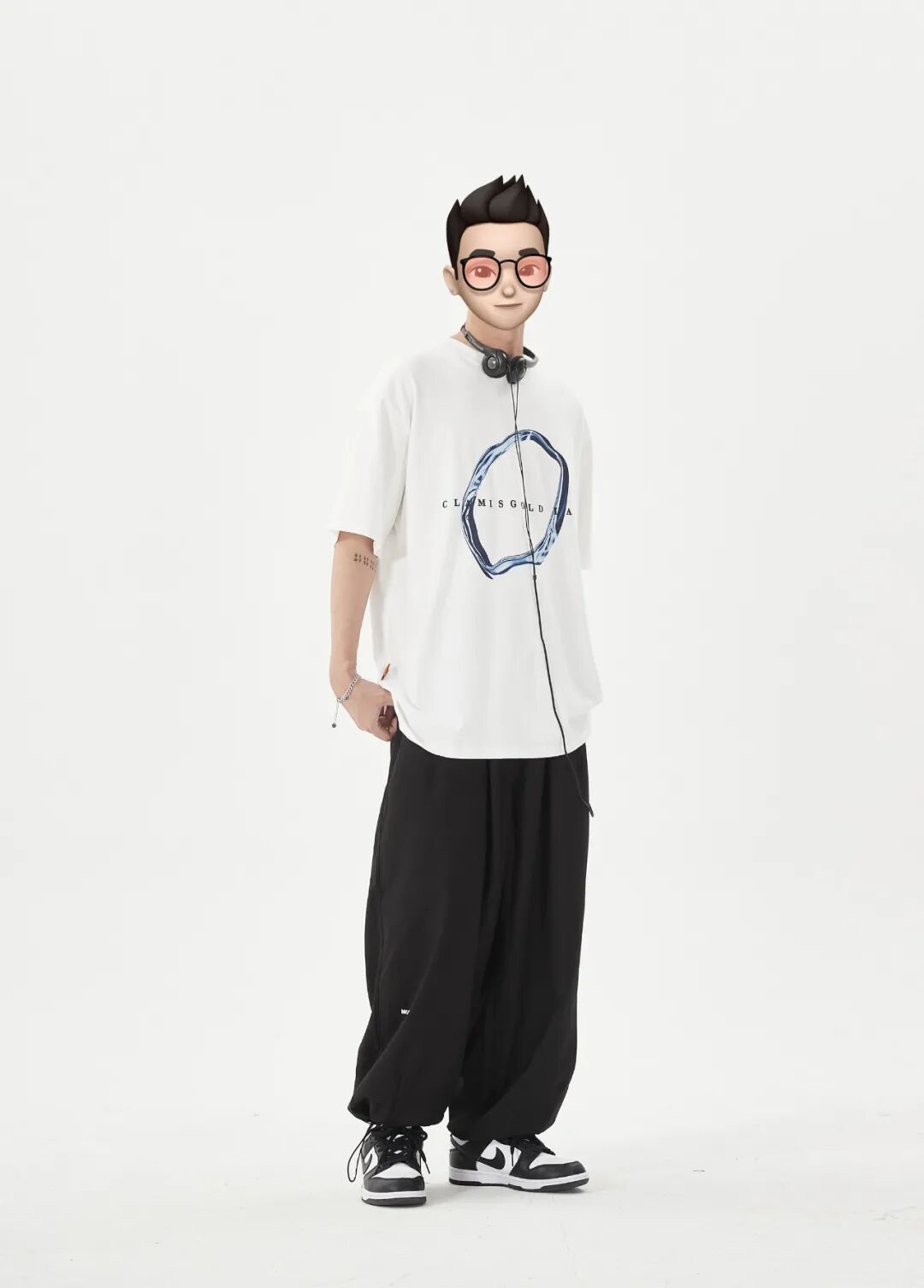上身一件白色3D金属感印花圆领短T,下身搭配黑色日系阔腿武士裤,最后上脚一双Nike Dunk Low黑白熊猫,青春感简直爆棚!