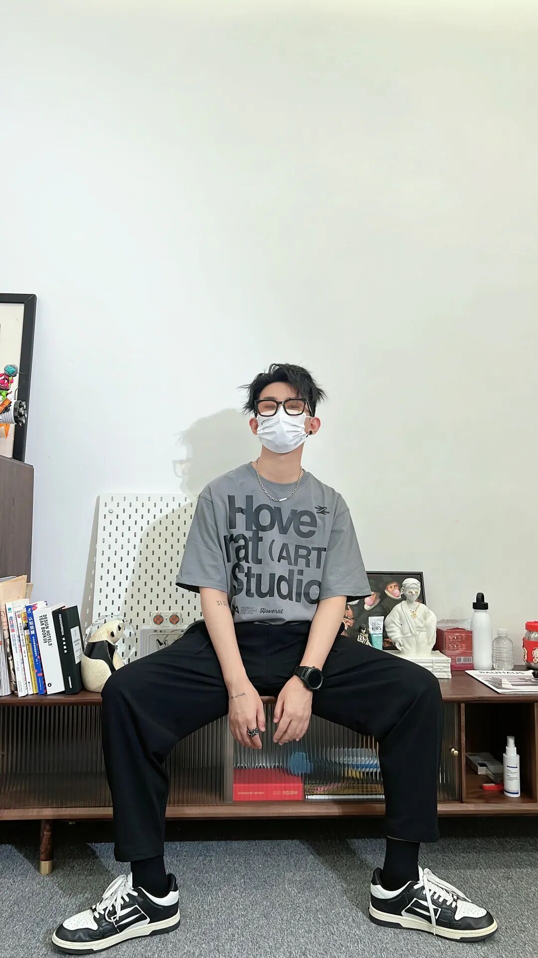又是一套黑灰的搭配,真的很不错!灰色T恤上身显气质的同时也有一定休闲感,搭配一条休闲风格的黑色裤子,绝对算得上经典,鞋子选择活力一点的板鞋、球鞋或者休闲鞋都可以。