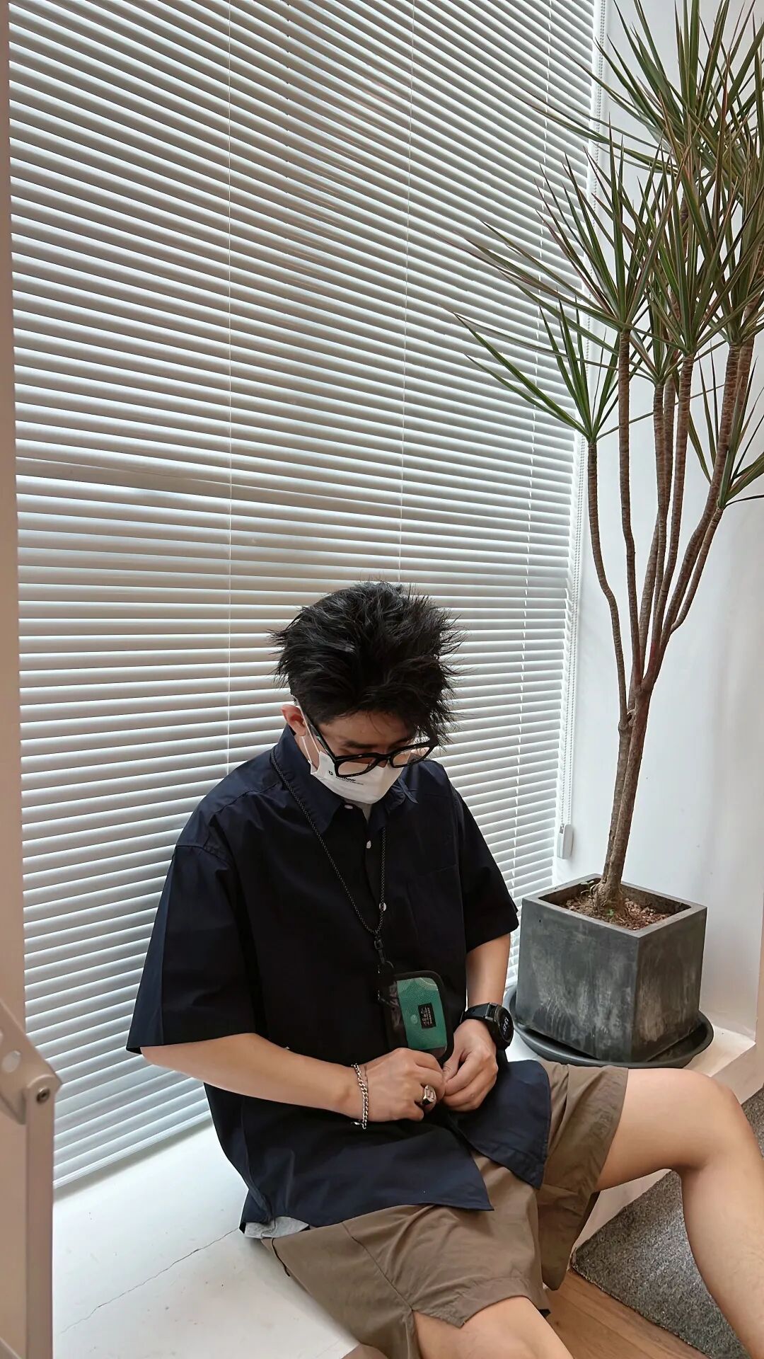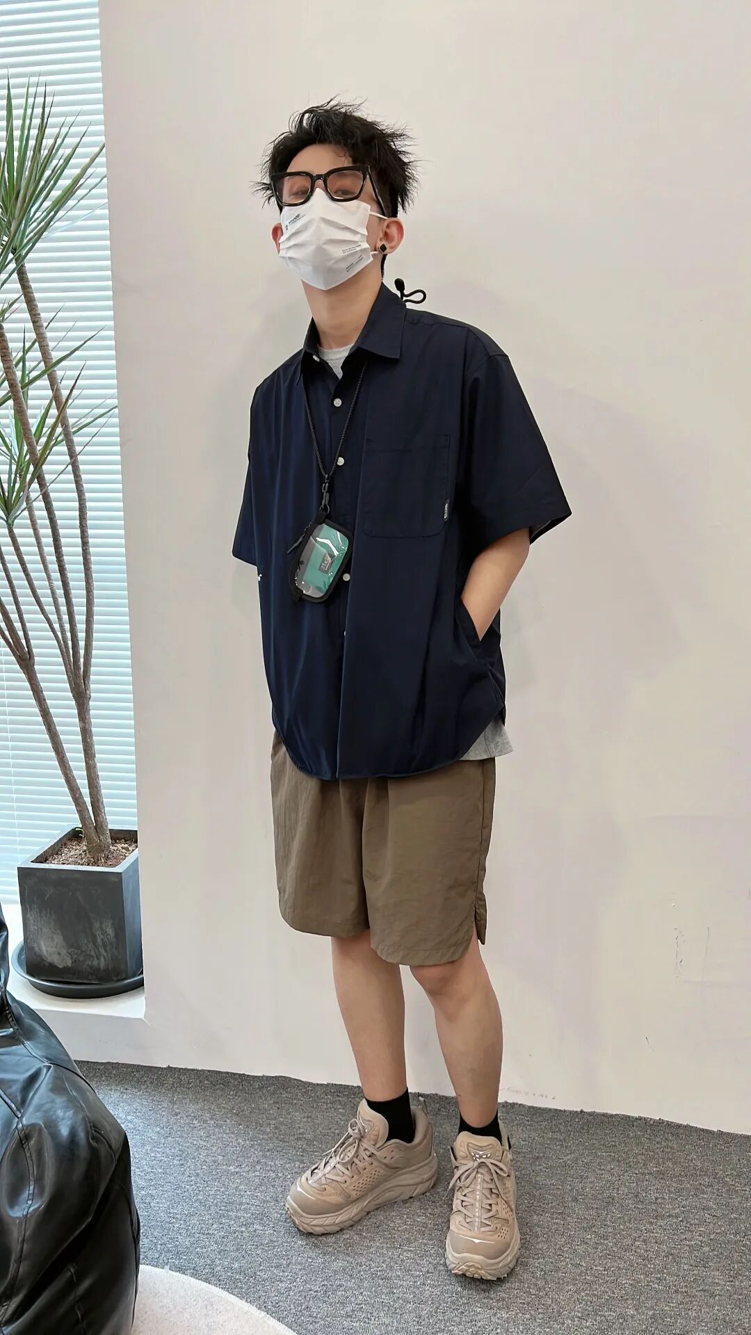 上身藏蓝色日系短袖工装半袖衬衫内搭灰色圆领短T,尽显文艺气质,下身搭配棕色轻薄夏季清凉短裤,上脚黑色袜子搭配hoka沙色户外登山徒步鞋,轻松拿捏露营搭配。