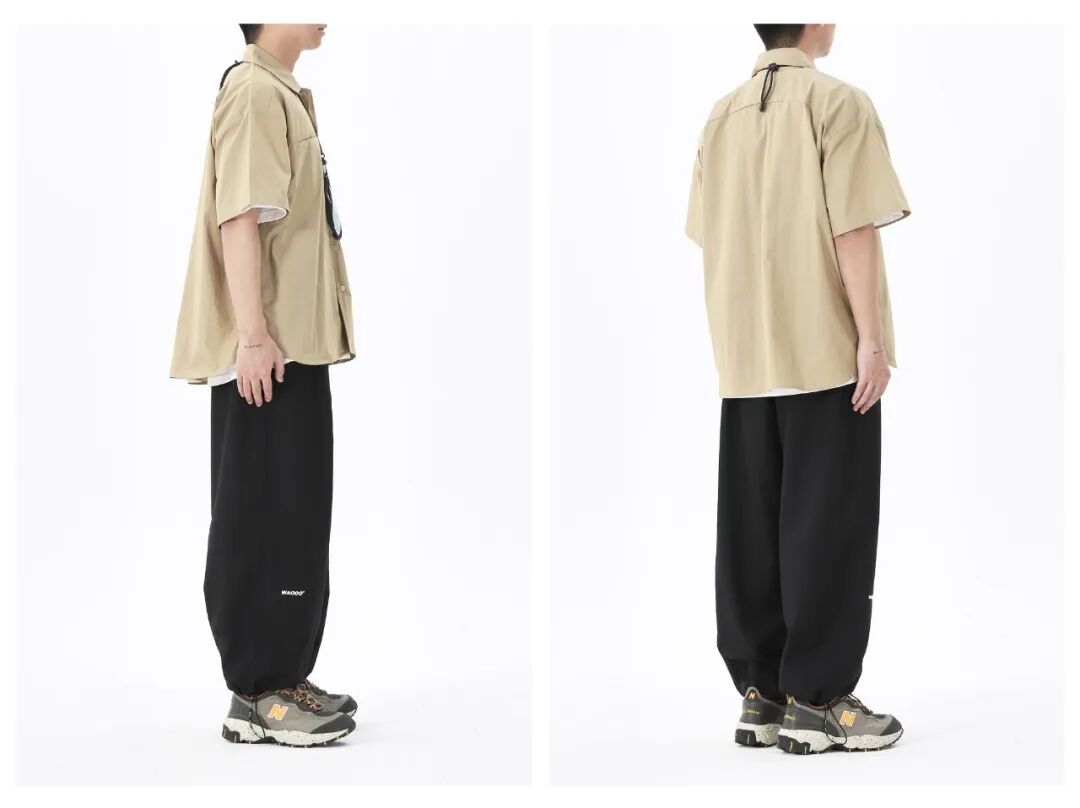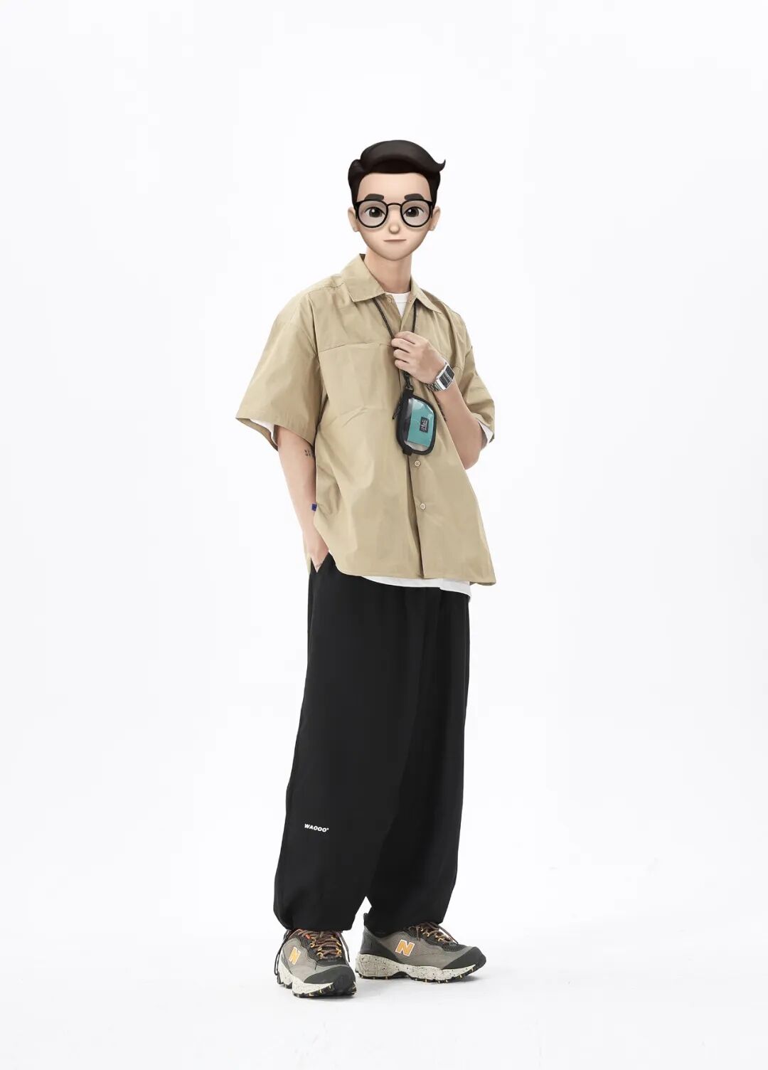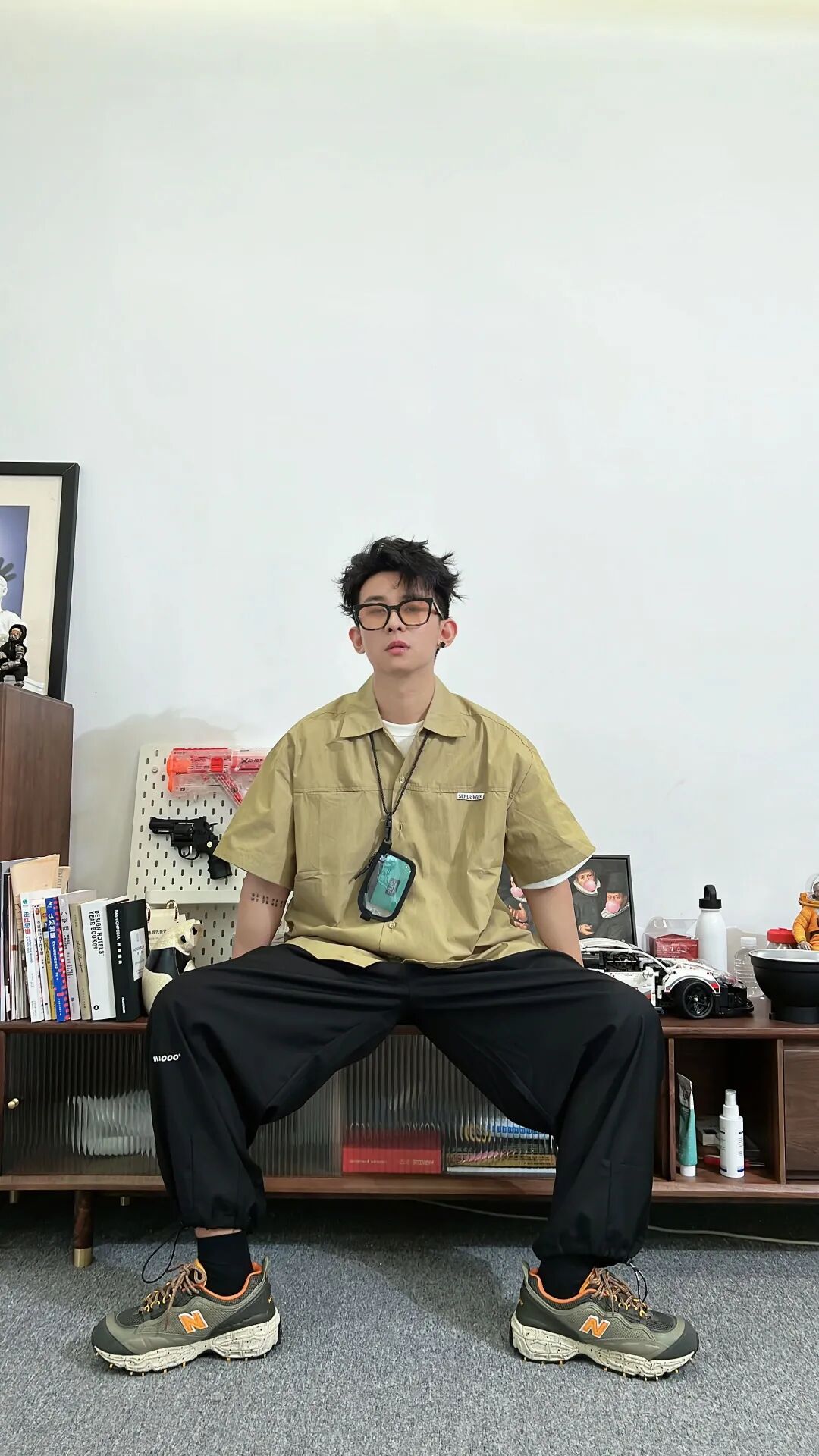 上身一件卡其色日系短袖衬衫,内搭白色立体印花圆领短T,下身搭配一条阔腿版型的黑色日系武士裤,最后脚踩一双大地配色的New Balance,武士裤+老爹鞋真的很妙~