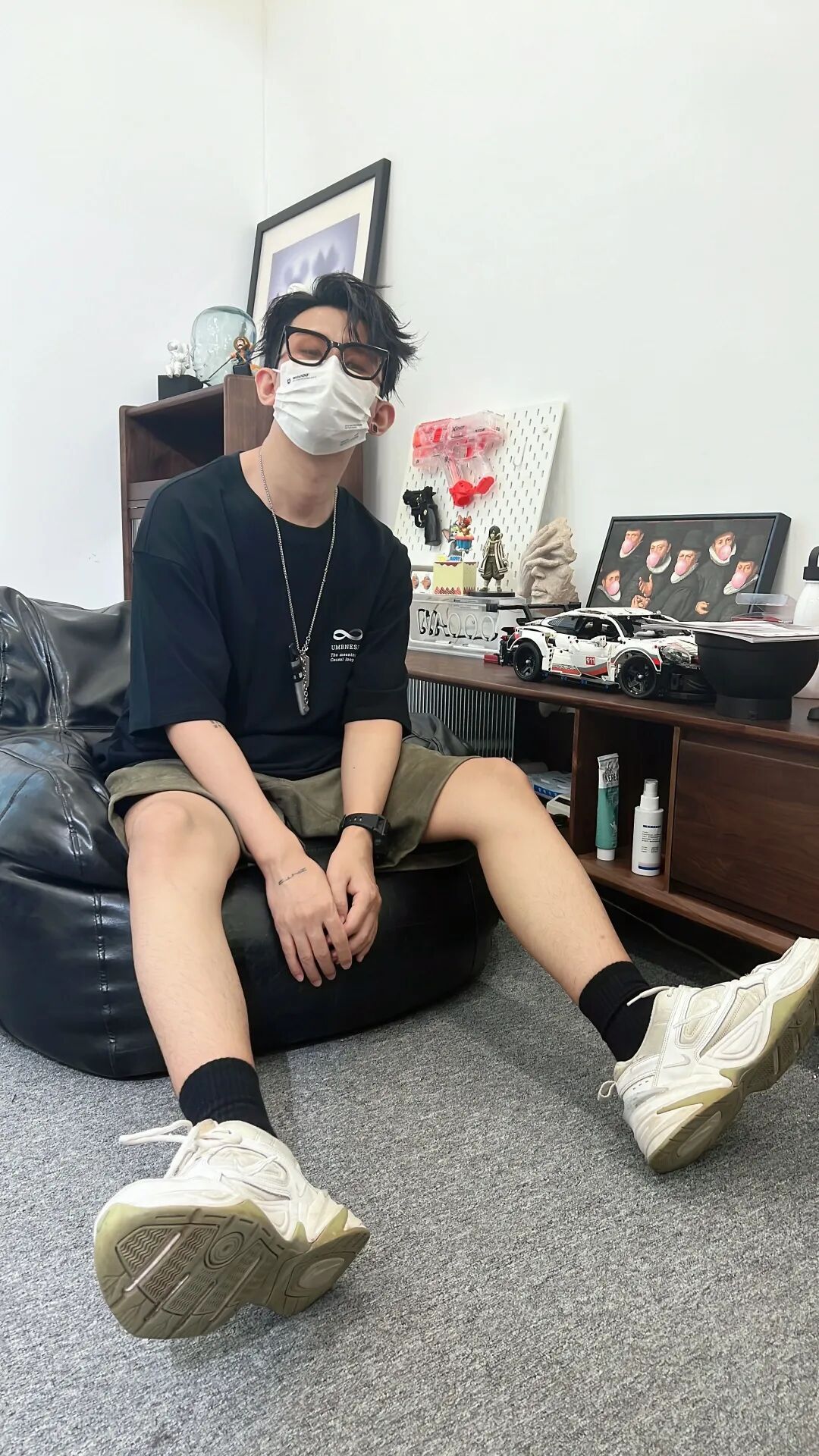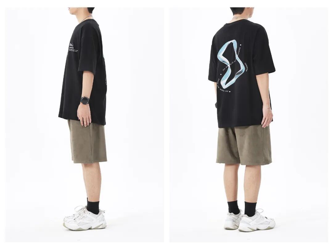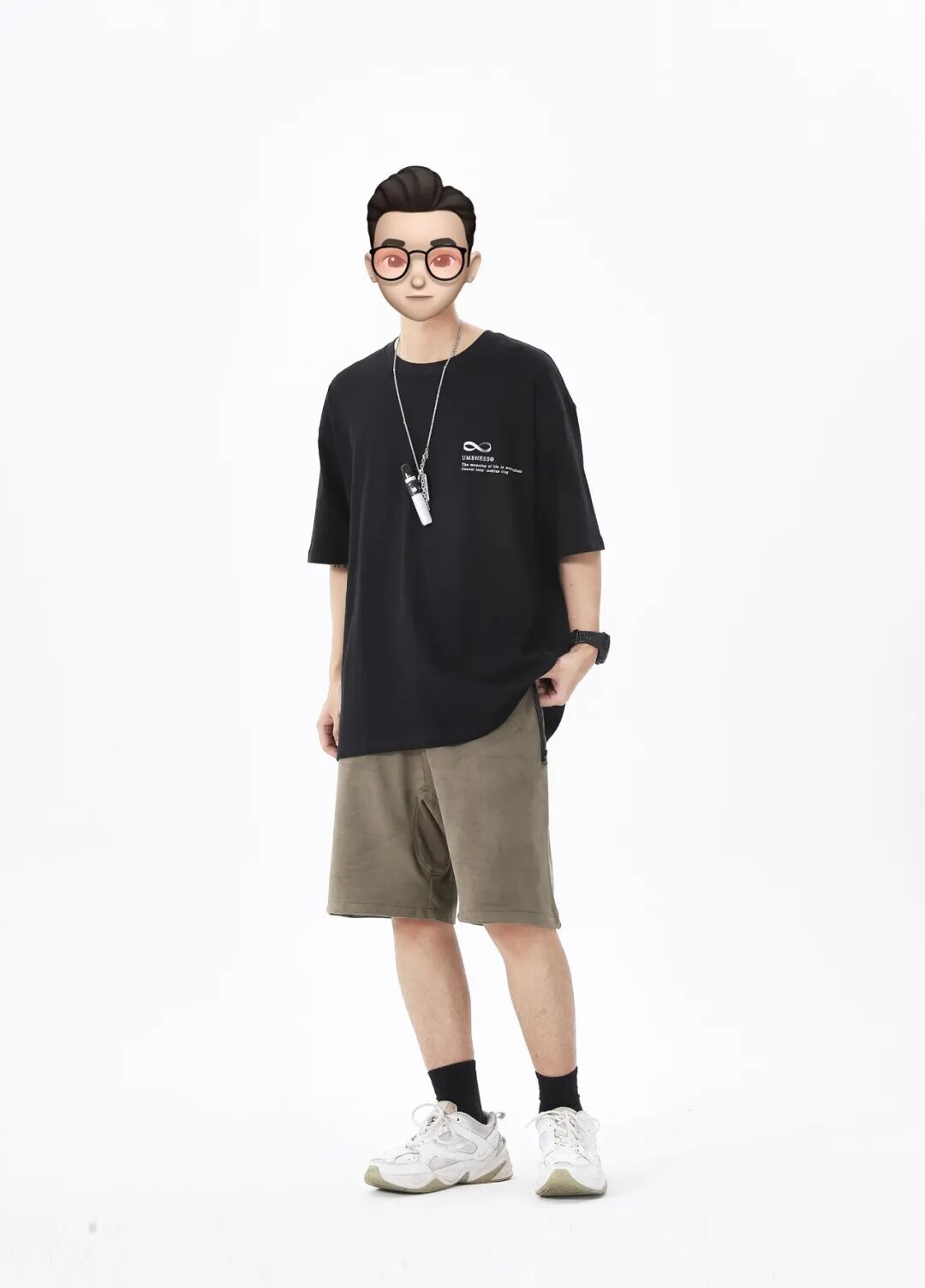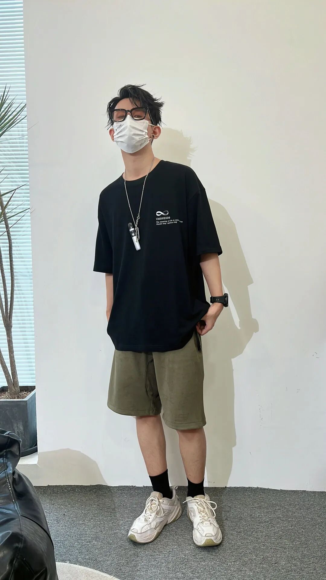 上身一件超酷的莫比乌斯环印花黑色短T,上脚黑色袜子呼应,搭配一条橄榄绿麂皮绒拼色五分裤作为过渡,增加色彩感,最后上脚一双白鞋子提升活力值,更显年轻。