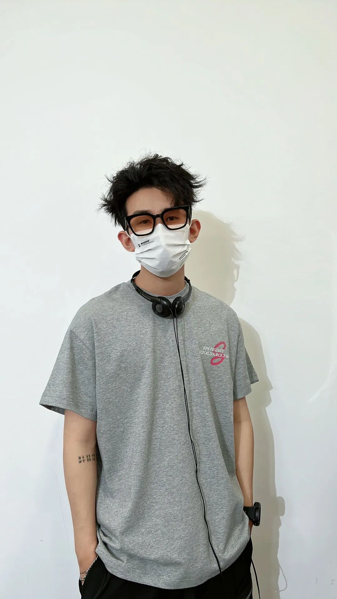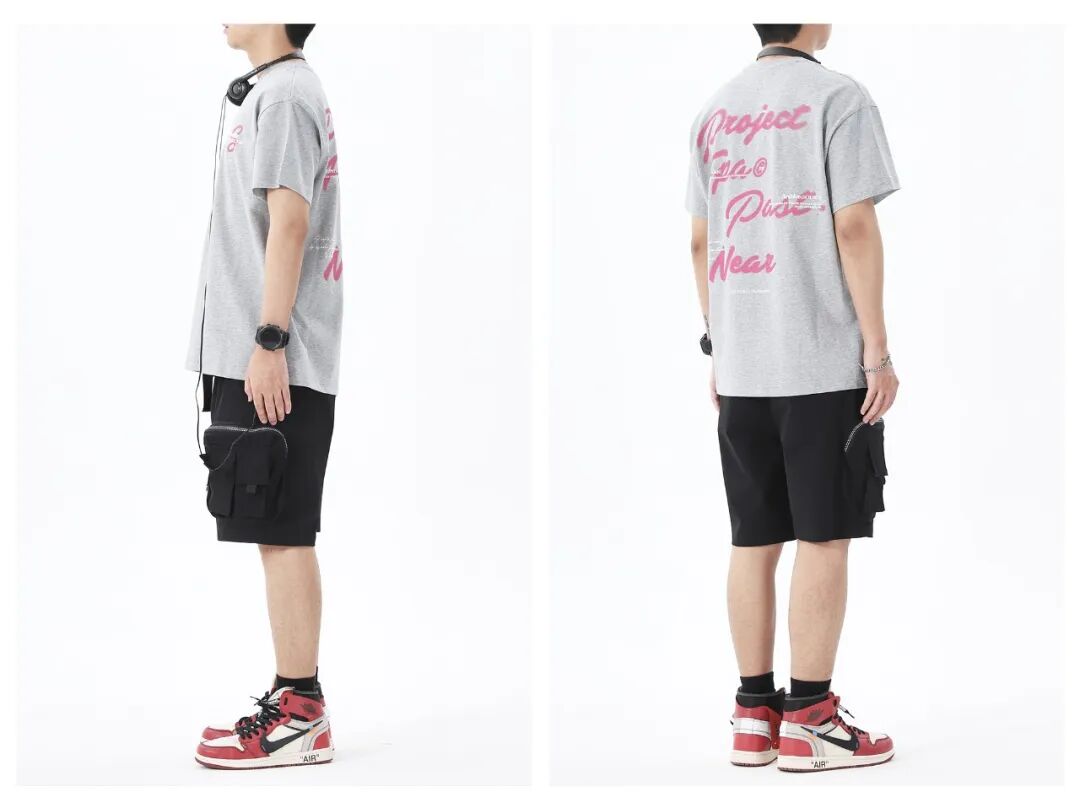 上身一件花灰色虚幻字体半袖短T,搭配黑色机能风运动大口袋五分裤,黑灰服饰下上脚一双黑红配色的高帮AJ,搭配挂脖式耳机和黑色手表,城市潮流的味道绝对够浓~