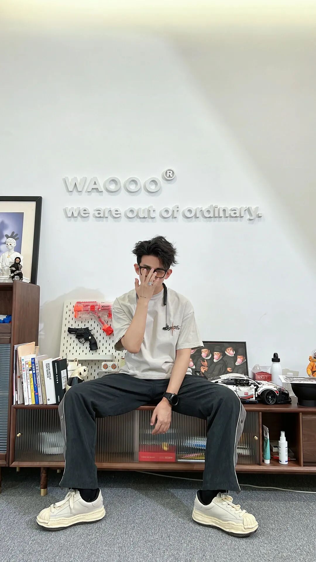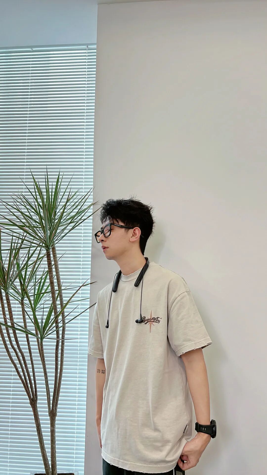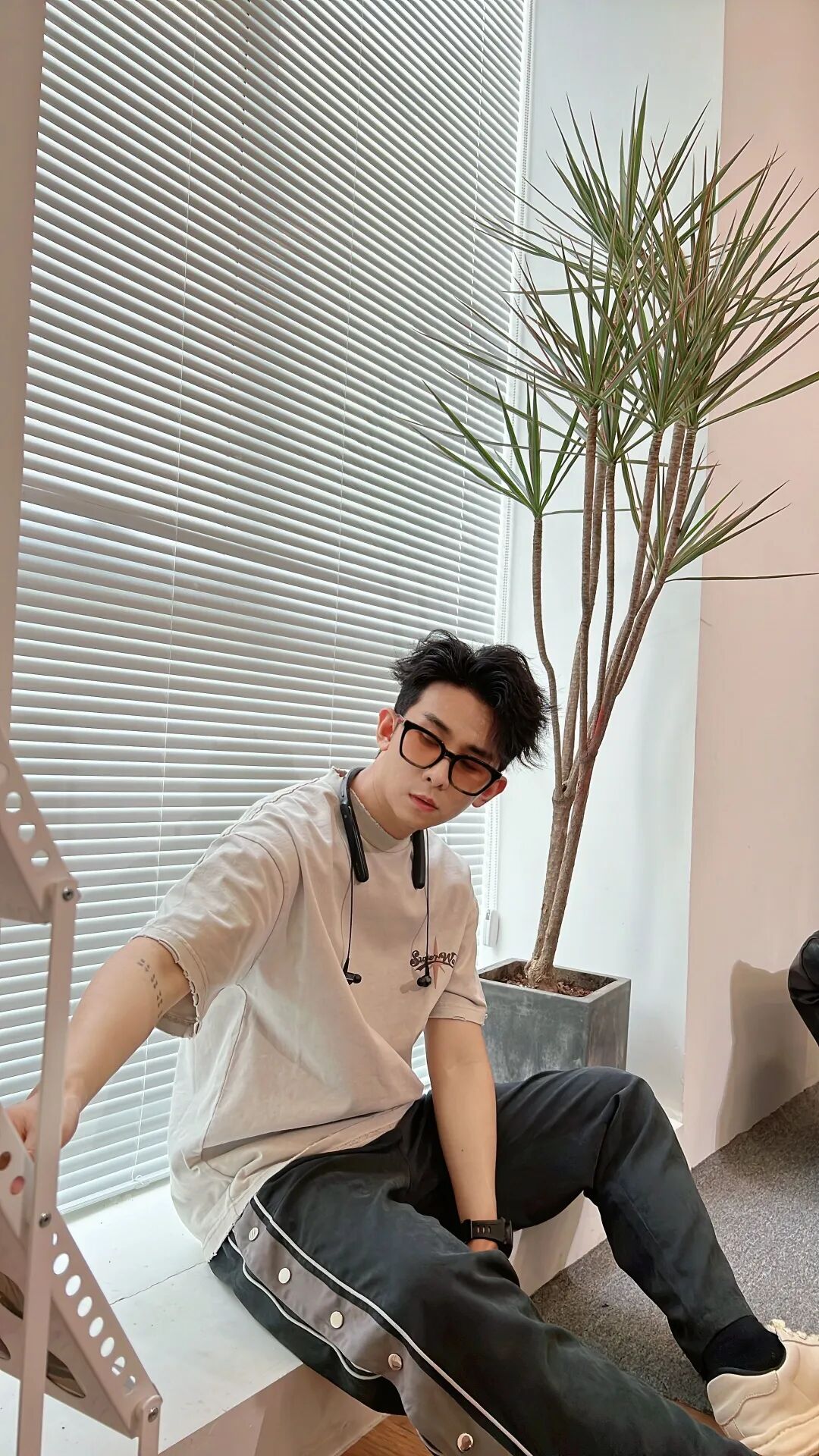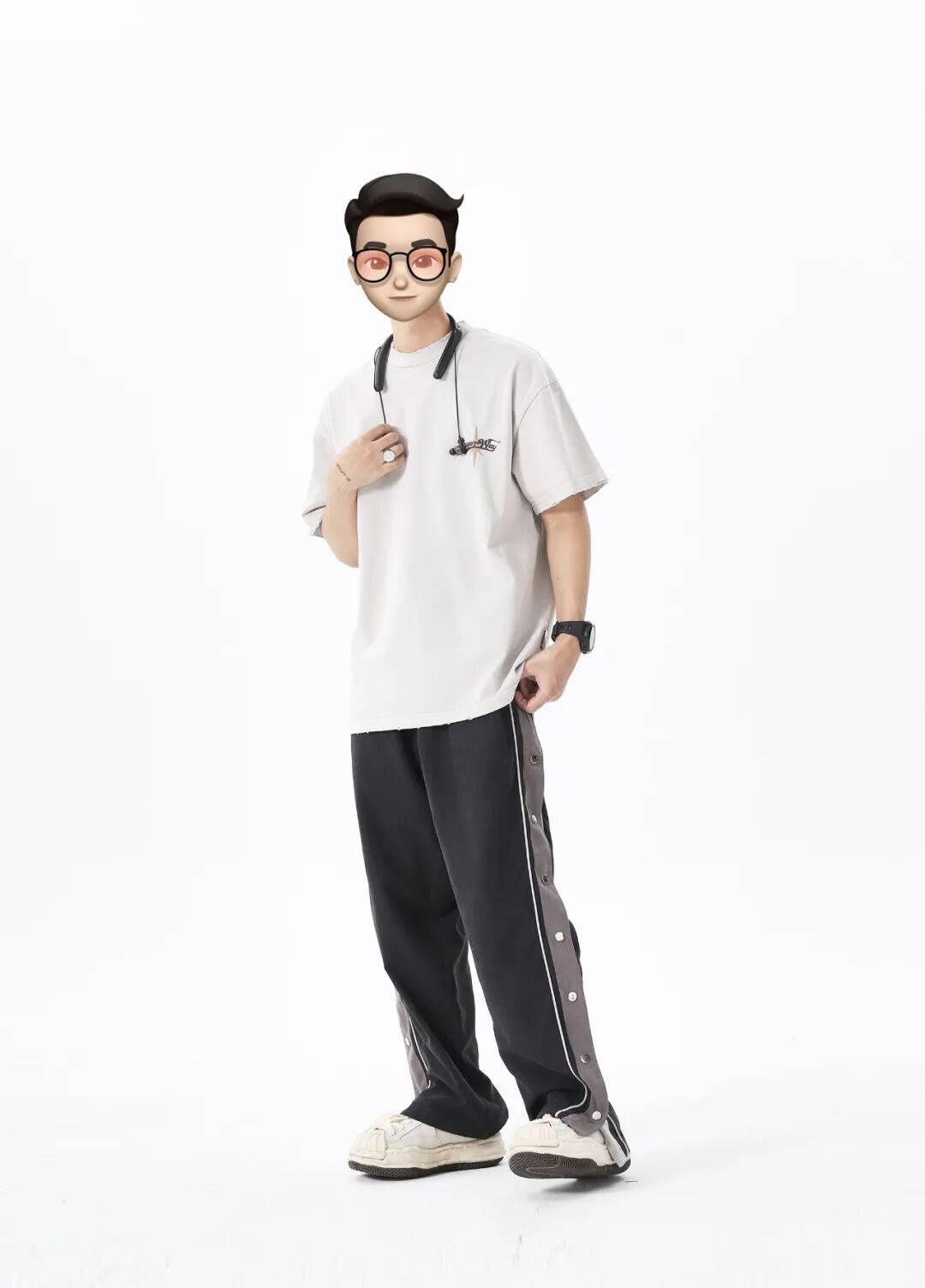 上身杏色oversize美式嘻哈短T,搭配一条水洗黑拼接排扣直筒裤,最后上脚一双米白色厚底溶解鞋与T恤颜色呼应,简洁又不会出错。
