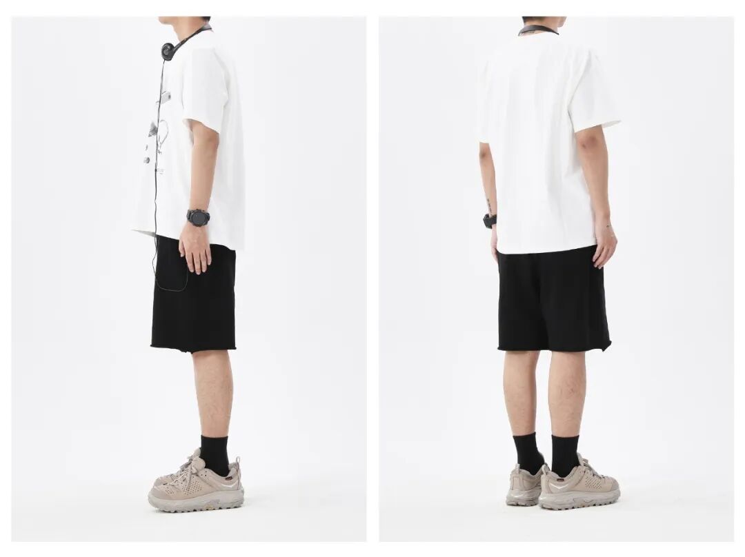 宽松版型的印花白T恤,搭配同样宽松版型的黑色短裤,算是基础穿搭中的王炸组合了,但是要注意,短裤虽然可以宽松,裤长尽量要控制在膝盖的位置,不要太往下,不然会显得整个造型很垮。