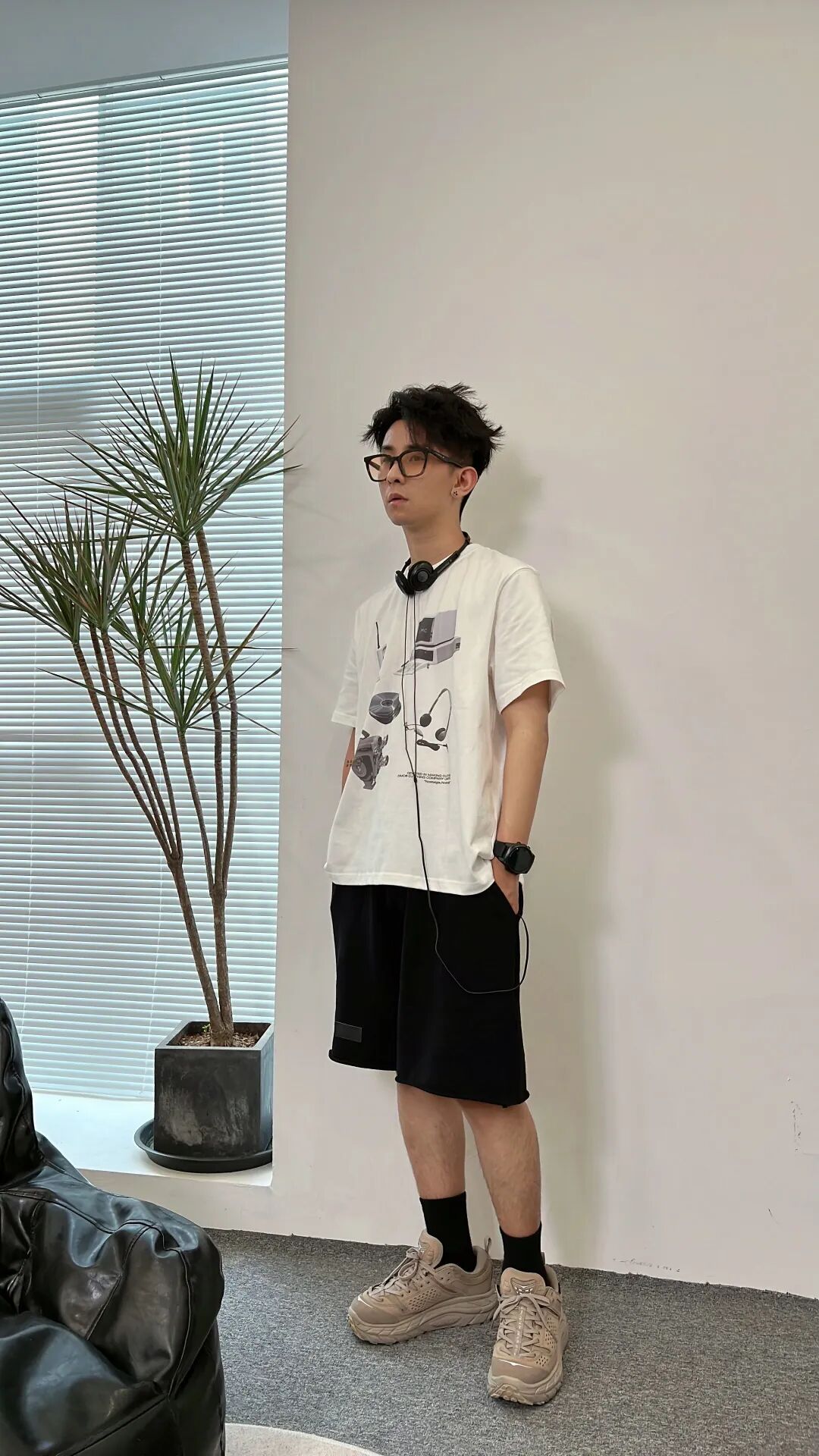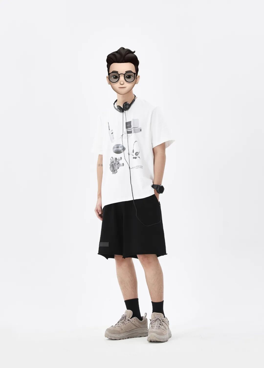 上身一件白色复古小物件印花半袖短T,搭配一条偏韩版的黑色基础款皮牌短裤,上脚黑色袜子作为过渡,最后脚踩一双灰色的Hoka户外徒步鞋。