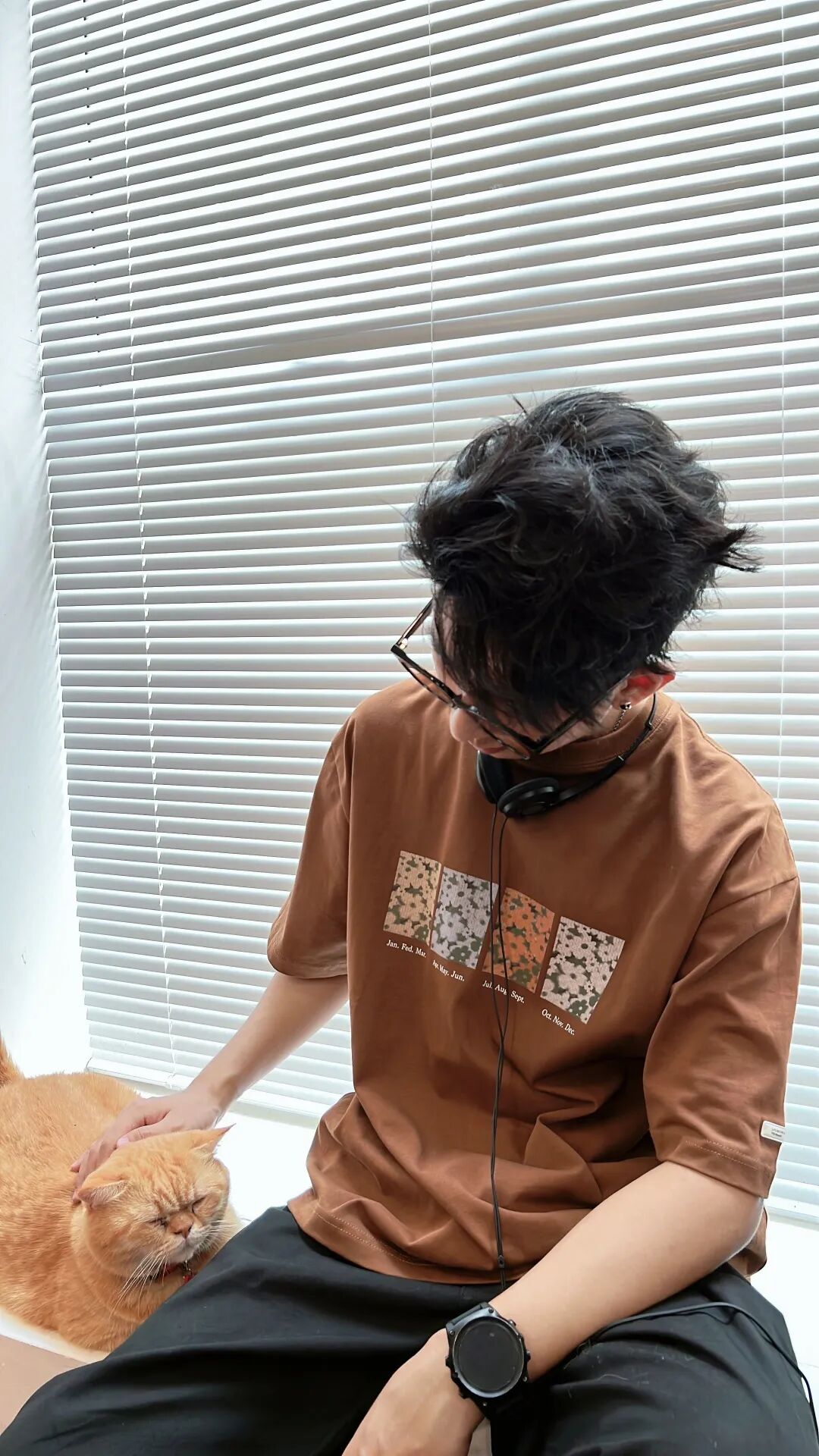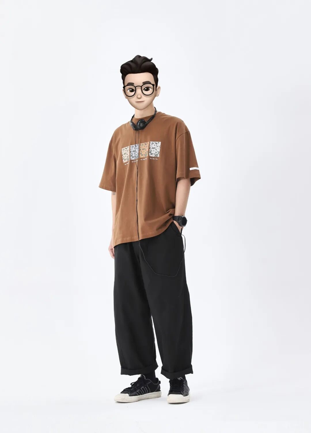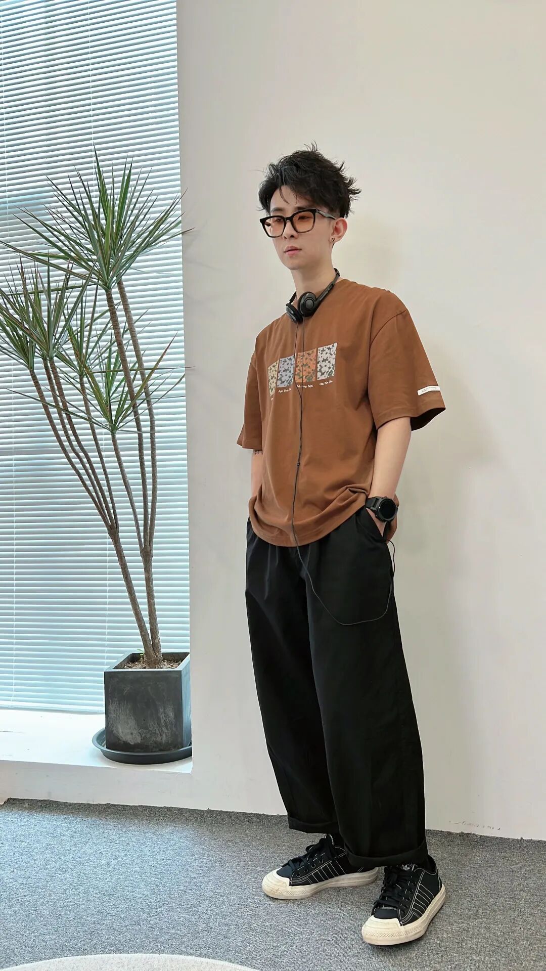 上身一件摩卡棕四季花卉图案印花短T,下身搭配一条宽松版型的黑色工装裤,再最后简单上脚一双Adidas的黑色低帮帆布鞋,用50%的色彩比例完成一套穿搭。