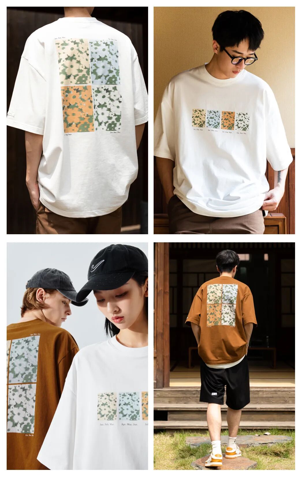 衣服采用的是32支230克的双纱纯棉面料,布纹非常清晰,厚度方面我个人认为是刚刚好,有分量感但是不会很闷热,而且手感特别柔软!制作上也是诚意满满,领口处做了内捆条和二本双针的加固处理,可以很好地防止变形,然后就是印花的设计,印花元素为四季花卉的植物图案,采用透底直喷的印刷工艺制作,细节感真的很足,摸上去有点磨砂的质感,非常棒!目前有象牙白和摩卡棕2款,建议喜欢的小伙伴可以尝试一下棕色喔!