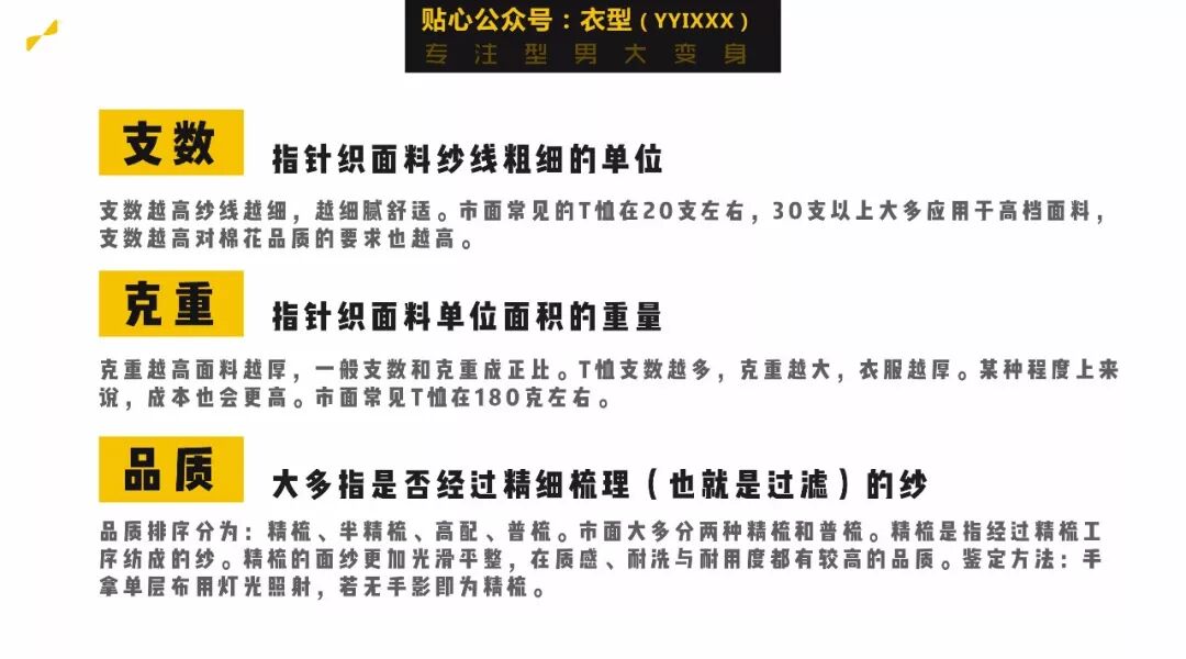 最常见的T恤面料是棉质针织面料,但棉质面料也有很多差别,主要看这三个信息。