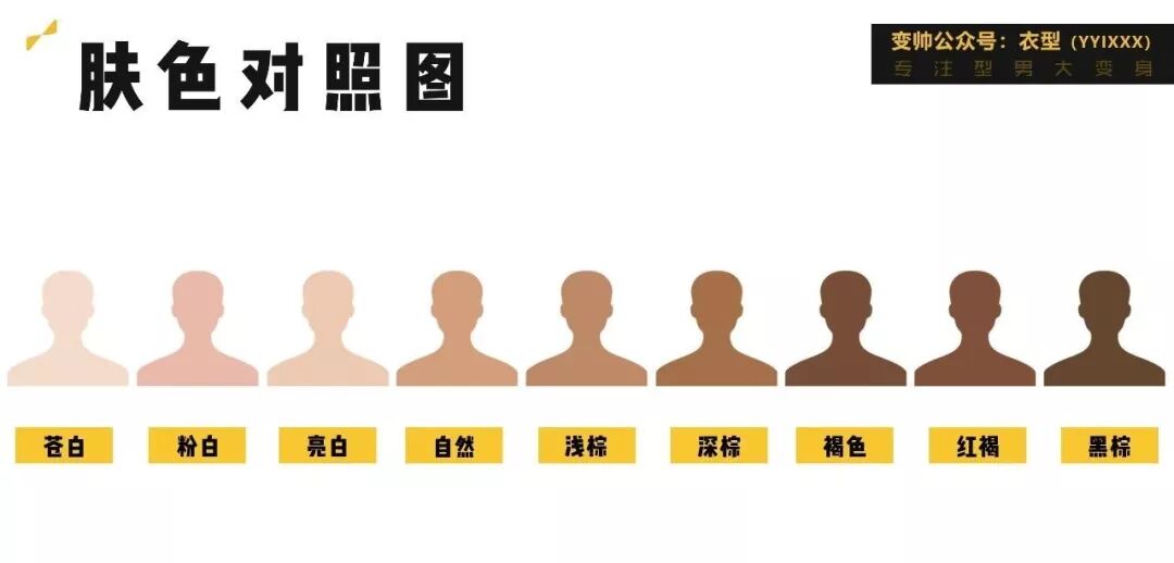那什么程度才真正算黑呢?大家可以参考下面这张图找到自己对应的肤色(自然光下观察)。以自然色为分界线,左侧为浅肤色,右侧为深肤色。