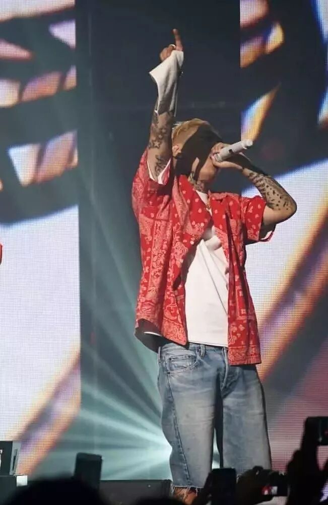 ps:去找韩国rapper们的穿搭图片时,发现很多rapper也会在现场穿得很“仙”,飘带、V领都有可能出现在他们身上,果然是个时尚年轻的国度。