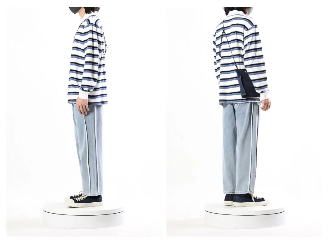 色彩以大片面的蓝为主调,制造清爽视觉感。上衣条纹元素斯斯斯文文,加上一条侧面拼接牛仔裤,穿上板鞋,