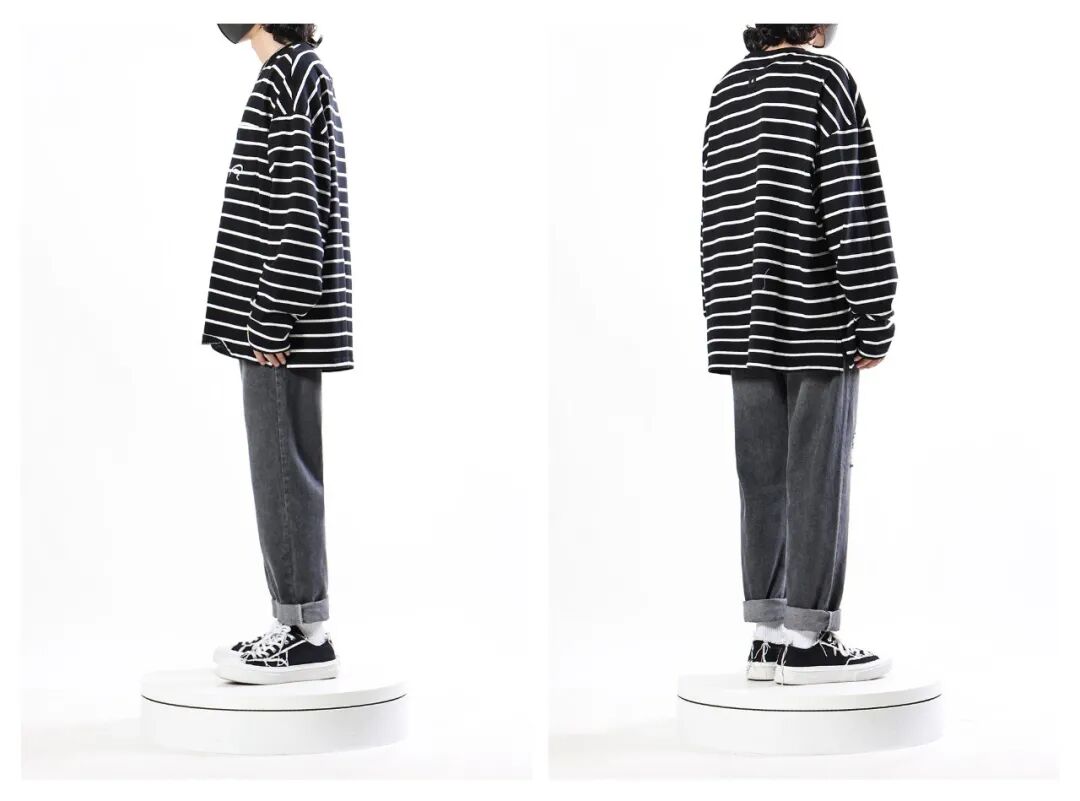 。黑白条纹长T与磨边破坏板鞋形成视觉碰撞,洗水牛仔裤过渡强化层次对比。