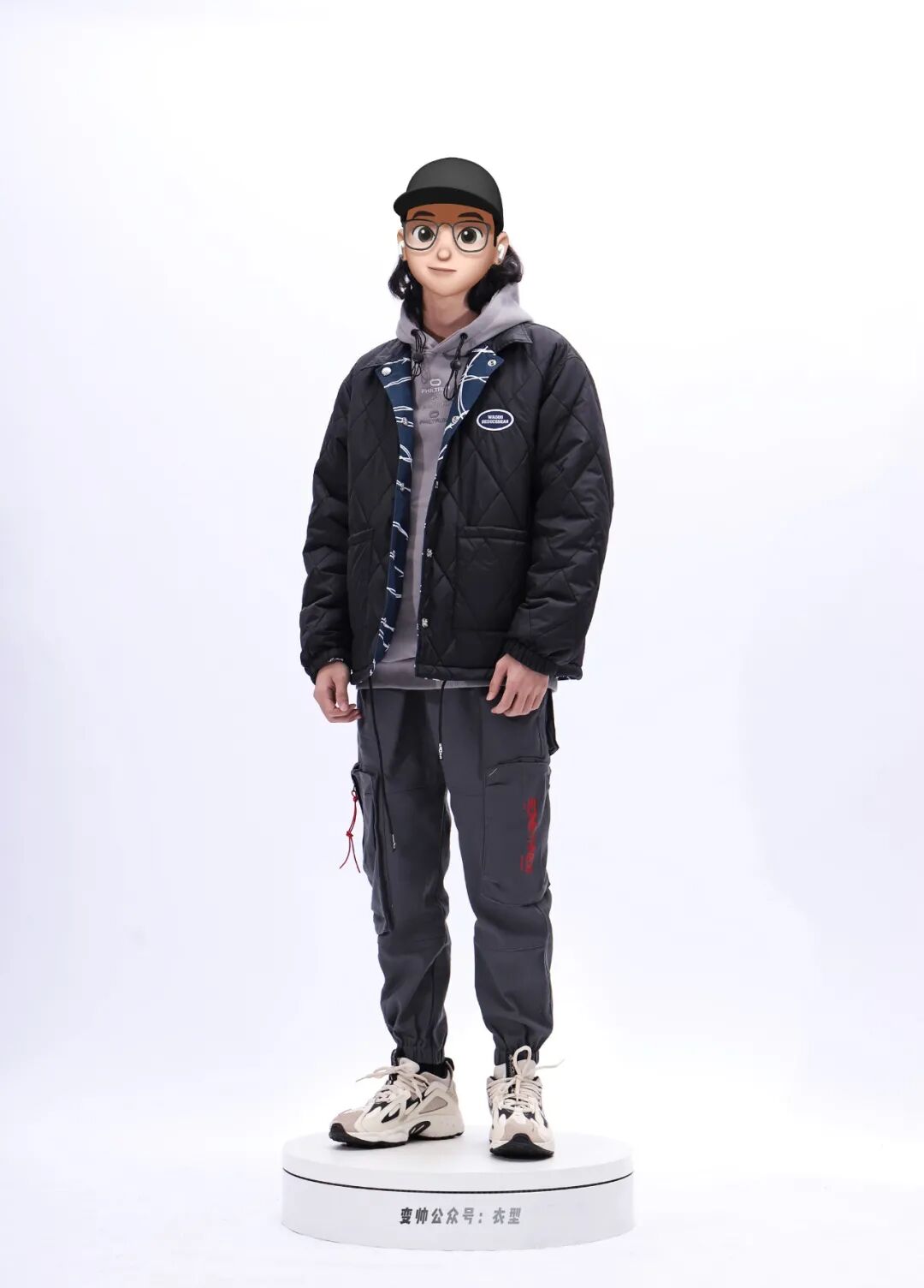 搭配解析:小有个性却十分百搭的日常穿搭!外套夹克露出相对沉稳的黑色菱格面,搭配卫衣营造叠穿层次,用黑色束脚裤压住视觉重心,并形成细节撞色,白色鞋子点亮,一套谁穿谁好看的黑白灰套装就OK啦!