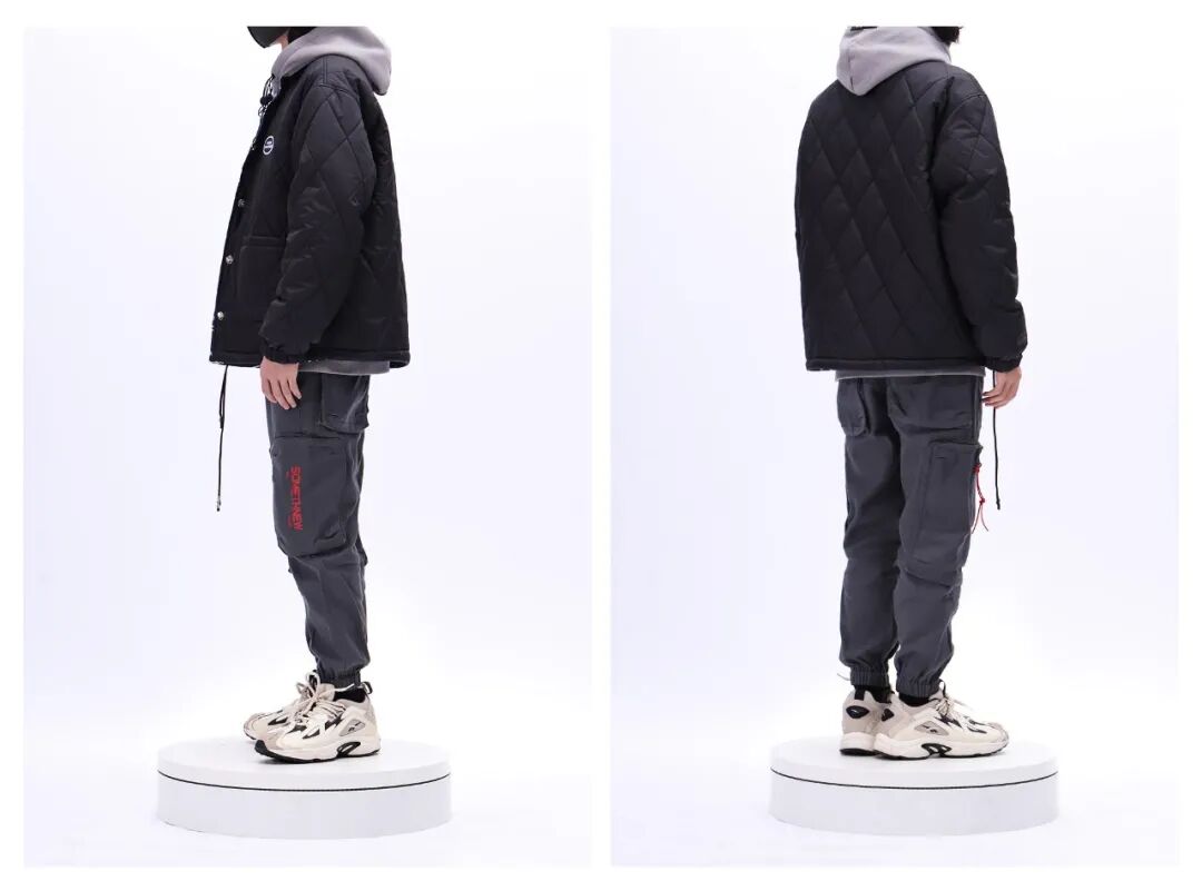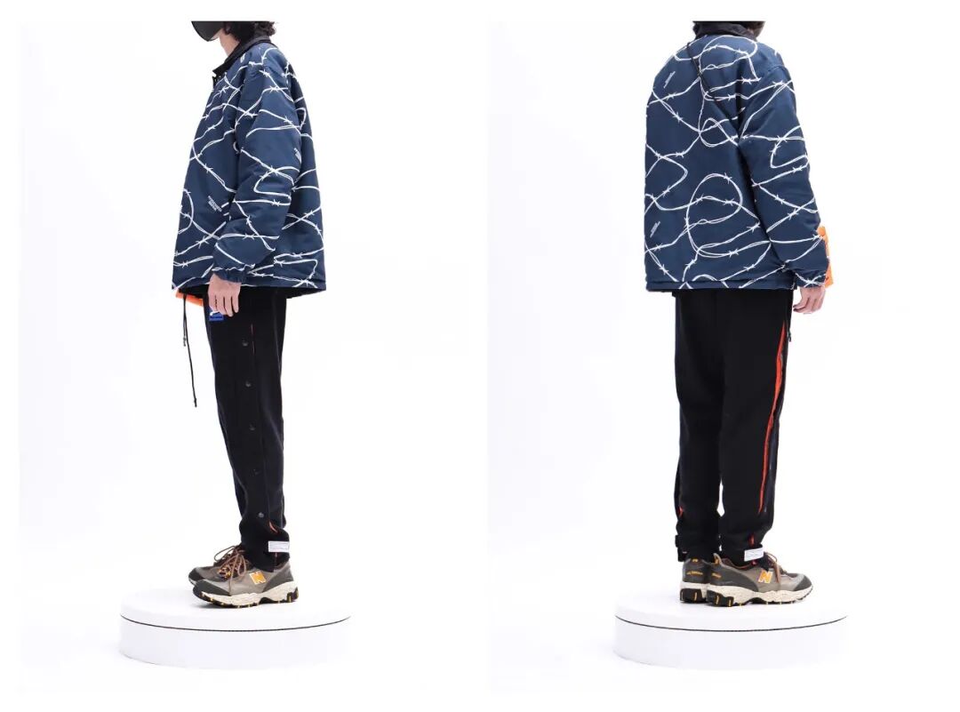 一面是个性十足的满印铁丝印花夹克,一面是简约百搭的黑色菱形棉服,口袋,织唛等细节也跟随两面的风格进行了细致调整,连暗扣也是特别定制的双面扣,搭配各种冬季单品,自如变换两种表现风格,日常穿搭简直不要太方便!而且温度较低时它还是可以做隔层,外套大衣打造冬季保暖look!