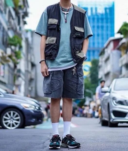想要多点层次感,可以在经典搭配的基础上,叠穿一件多功能口袋马甲,丰富整体造型。内搭T恤的颜色可以随意切换,这样穿出街,你就是整条gai最显眼的存在!