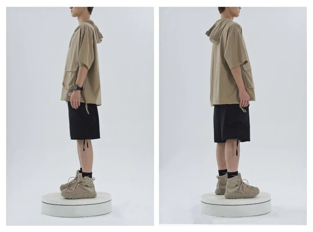 宽松舒适的版型,宽边车缝线平整紧密。随性慵懒的五分袖,舒服好穿。前身两个立体口袋既美观又实用,凸显了工装型男又潮又有型的气质,下摆运用了抽绳可以自行调整松紧,帽子抽绳尾部运用了胶粘制(妈妈再也不用担心我掉绳啦)。左下摆缝制了一个镭射的反光标,为整件衣服增添了一丝独特叛逆气息,穿上它你就是妥妥的又酷又飒夏日少年!而且,这件t恤还非常百搭,搭配短裤长裤都很好看。T恤是锦纶面料的,夏天穿凉爽舒适速干,垂坠性良好,完全不用担心运动完的时候衣服会紧巴巴的贴在身上。除了卡其色,还有黑色、浅蓝色,任你挑选。(复制下方淘口令打开淘宝,或搜索框输入灰链接即可购买)