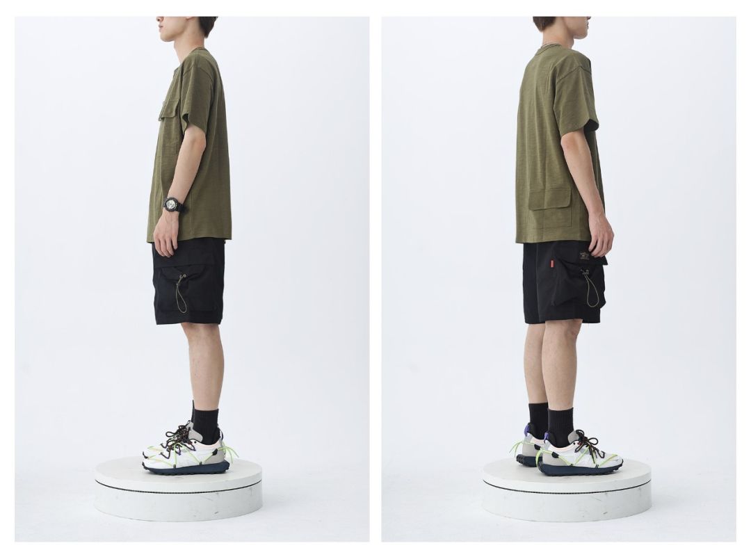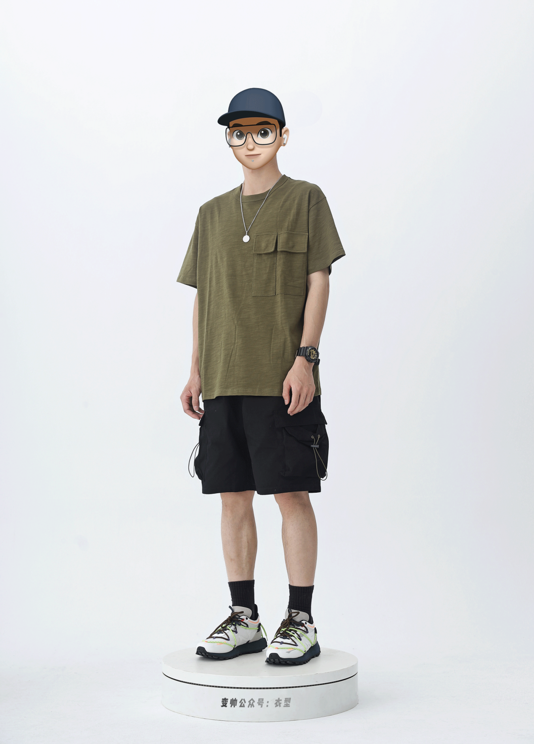 搭配解析:这套与上一套虽然都是大口袋设计,但风格完全不同,更偏向日系复古休闲,喜欢日系风的型友必入!!!军绿色T恤与黑色珠帆格工装短裤的搭配,使人联想到夏日里温柔的日系男孩,裤子的口袋运用了抽褶设计,实用美观,与衣服相得益彰。穿上你就是清爽的日系男孩,喜欢就入!!!日系工装大口袋,显白稚气显少年。
