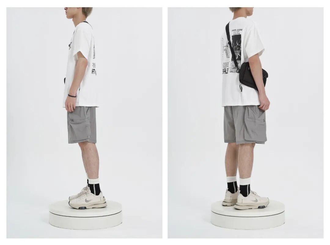 搭配解析:视觉上非常柔和的一套搭配。白色T恤上的像素化文字颇有复古怀旧的感觉,背面的平面线条化人脸与星际图案混搭熏陶出一种未来科技感抽象氛围,百搭且特别!再搭上一条灰色立体口袋裤子,背个斜挎包,看起来轻松惬意,夏日舒适柔和yyds!力荐单品:FPA(VENGETICE) 宽松薄款休闲机能中裤