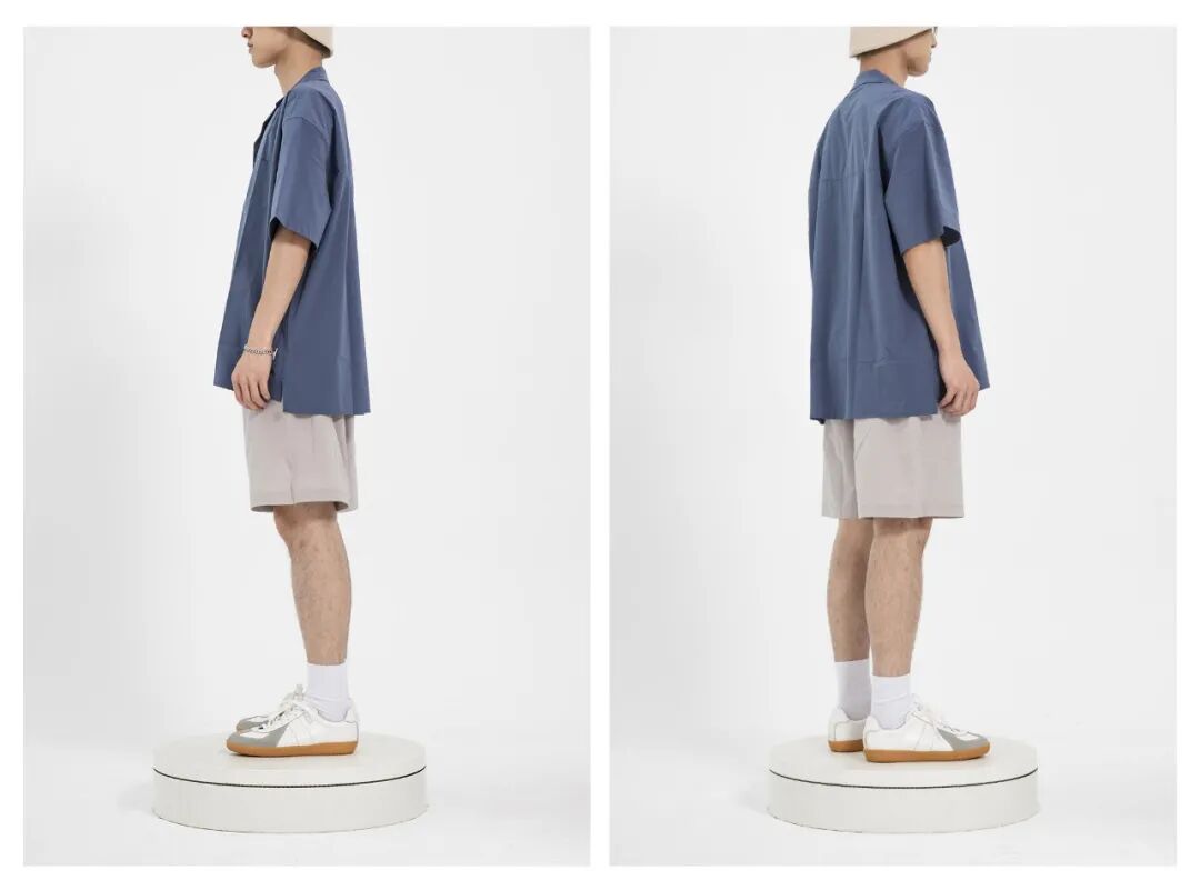 搭配解析:一套仿佛带着海滨气息的搭配,穿上你就是海边散步时慵懒的少年~蓝色衬衫宽松而又柔软,质感满满~搭条灰色宽松短裤,清透舒适又凉爽!白鞋作为点缀,衬出清爽气质~好看慵懒气质佳,穿上秒变男神!