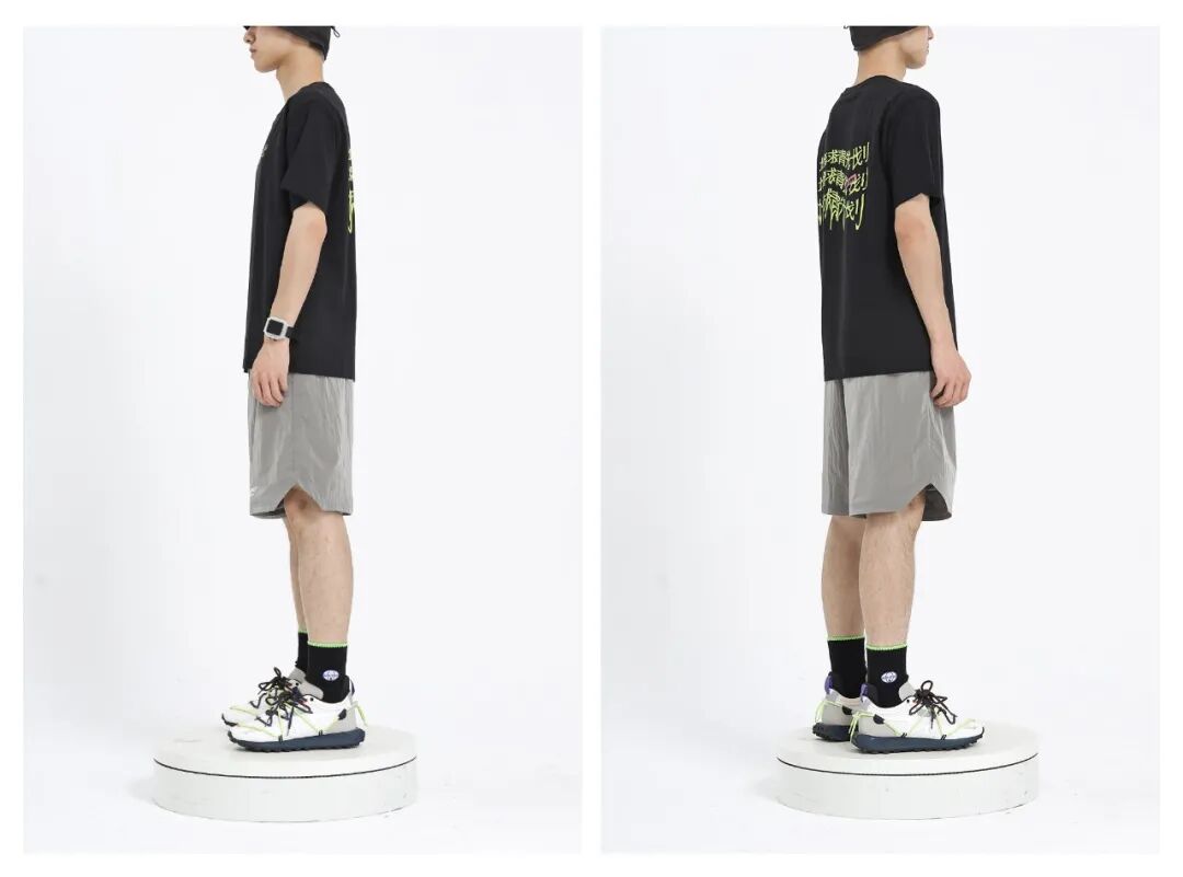 搭配解析:上衣是简单的黑色基础款短T,搭配有轻微皱感和光泽的灰色五分运动短裤,通过鞋子、袜子和衣服文字的黄绿色点缀,为整体增添几分活力。