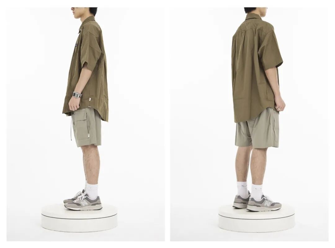 搭配解析:内搭一件白色T,套一件cityboy风格的素色短袖衬衫,再搭配一条卡其色多口袋工装短裤,配搭项链和手表增加细节,最后上脚一双朴素的“N仔”提升整体度。