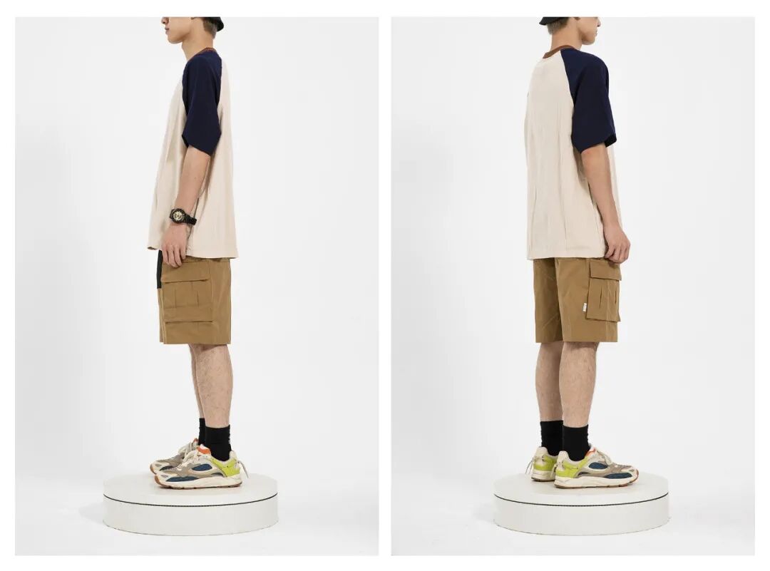 搭配解析:上身一件拼色短T,搭配一条卡其色休闲工装裤,上脚黑色长袜修饰脚踝,再踩一双邻近色配色的老爹鞋映衬整体。