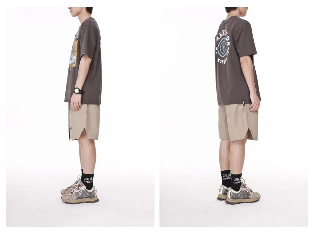 搭配解析:上身一件深灰色印花短T,再搭配一条开叉五分裤,再上脚一双大地色老爹鞋呼应整体配色。