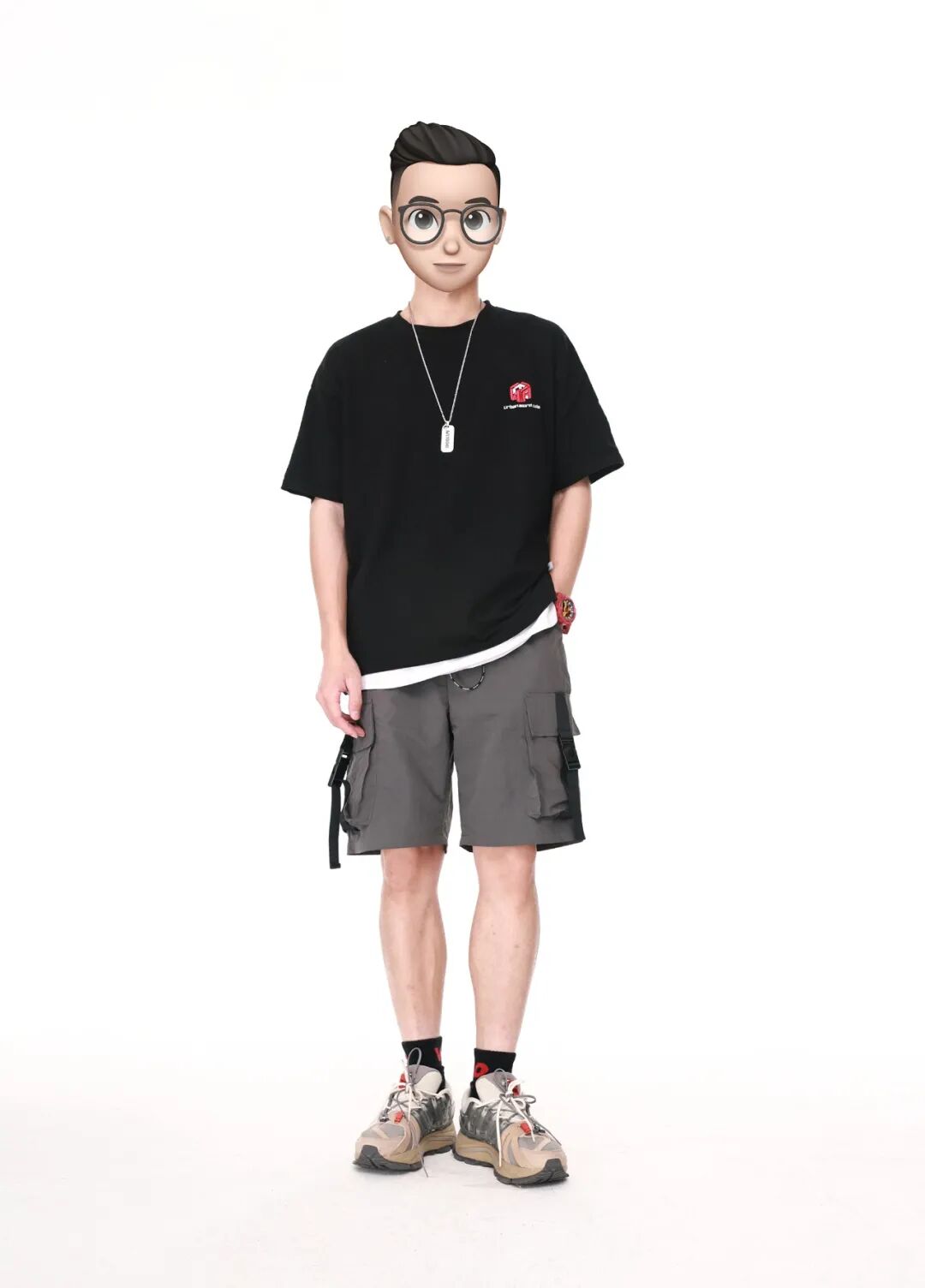 搭配解析:上身穿一件黑红logo T,内搭一条白色的基础款屁帘,再搭配一条灰色五分休闲裤,再脚踩一双蓝灰色Nike,以黑红配色的袜子呼应短T。