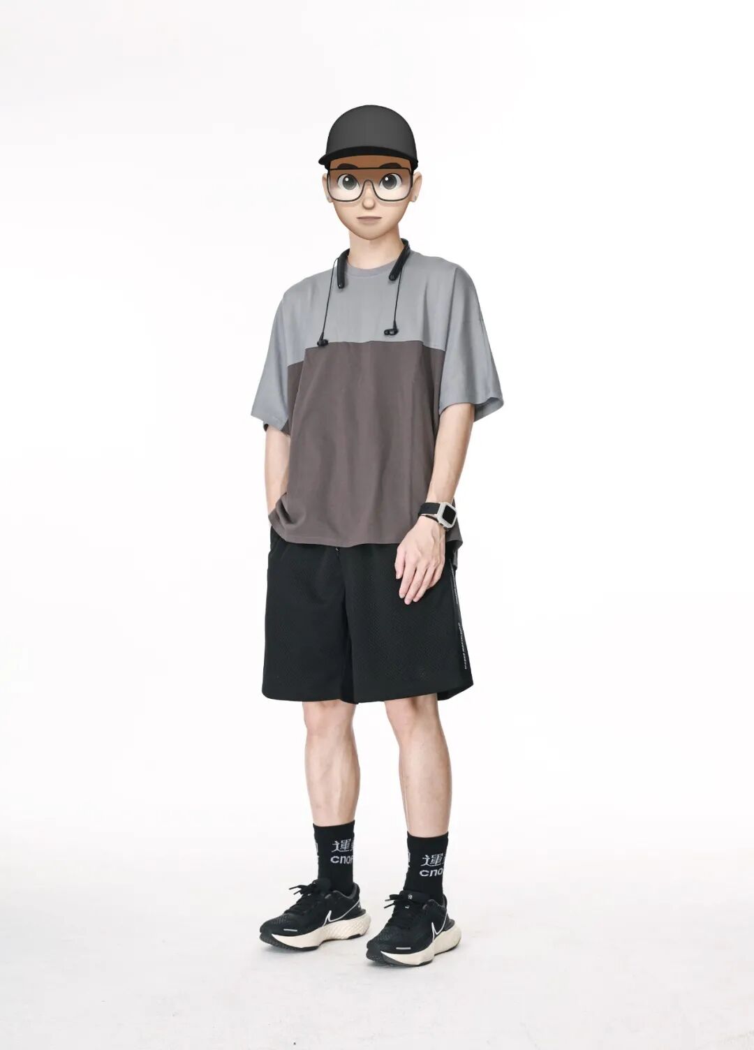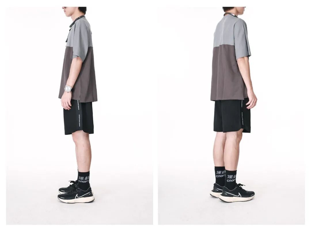 搭配解析:上身穿一件撞色拼接灰短T,再搭配一条黑色运动网短裤,再上脚一双黑色网纹Nike呼应短裤,稳住重心。