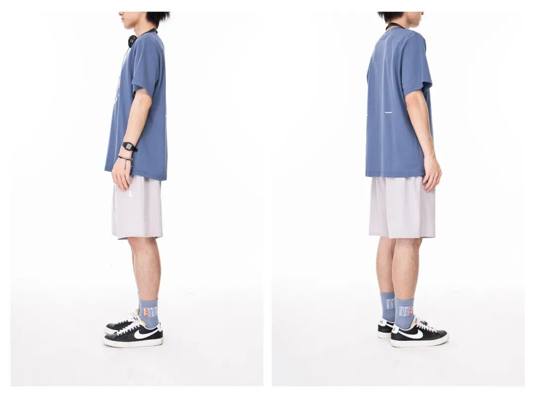 搭配解析:上身一件蓝灰色冲浪河马印花短T,下身搭配一条灰色五分沙滩裤,上脚一双黑色Blazer搭配蓝灰色中筒袜,稳住重心的同时让颜色与上身呼应,活力感与清爽感并存,走在街上就跟冲到浪尖一样!