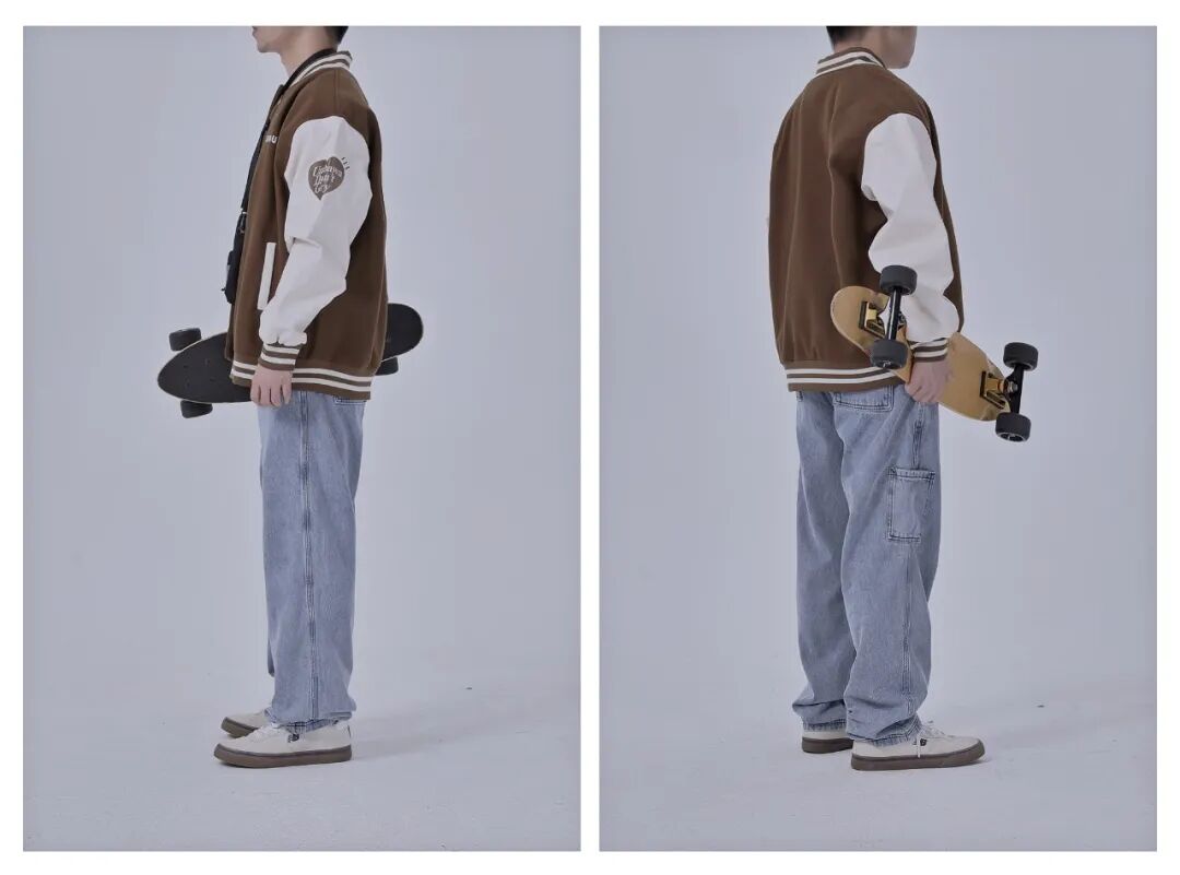 以重磅白T为内搭,外穿一件咖啡色美式休闲棒球夹克,挎一个灰色小包增加胸前细节,提高便携性、降低累赘感,再搭配一条复古牛仔阔腿裤,最后上脚一双生胶底NB 呼应夹克。