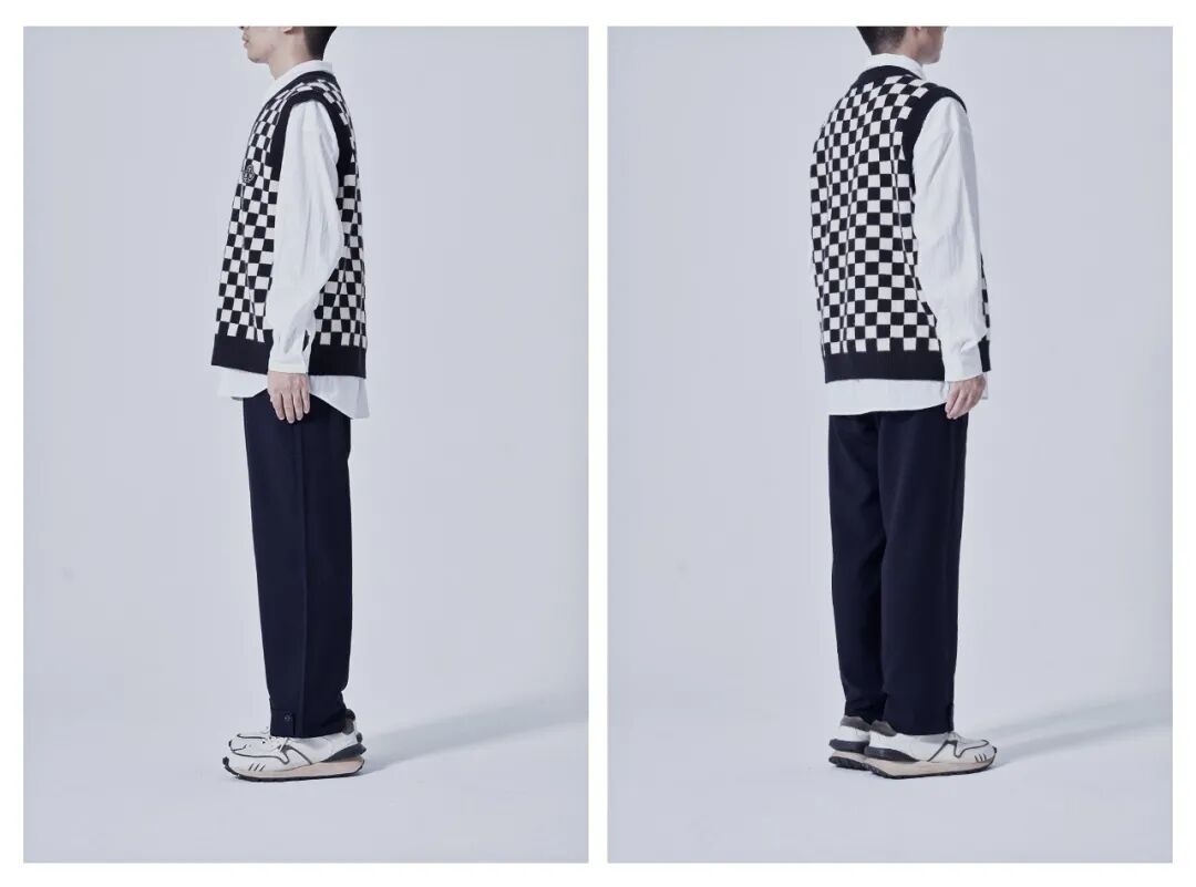 背心+衬衫这对内长外短的组合,瞬间营造出上半身的层次感。下身藏青色裤子与棋盘格相呼应,保持视觉平衡,不会太素也不会突兀。上脚的复古运动鞋可稳住视觉重心。想尝试学院风的小伙伴可记住这3点,百试百灵!