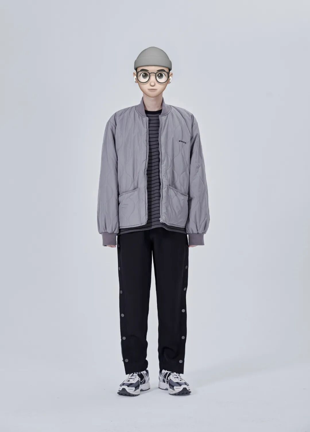 内搭一件条纹毛衣打底,再上身一件美式复古短裤夹克外套,搭配一条黑灰撞色侧排扣运动束脚裤,再上脚一双蓝灰配色的Nike作为视觉亮点。
